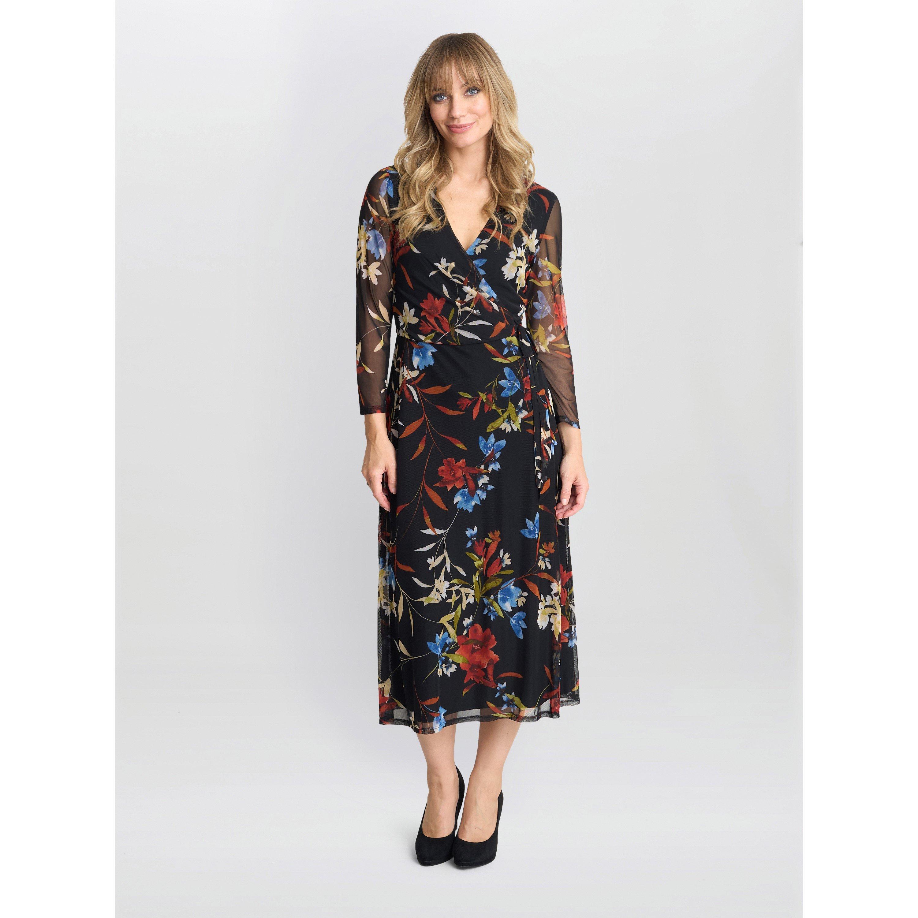 A modern printed mesh side tie, faux-wrap dress. With sheer long sleeves, adding a touch of allure, and a sophisticated plunging v-neck that draws attention to your neckline, creating a flattering and stylish look. This midi dress is slip on and measures 122cm