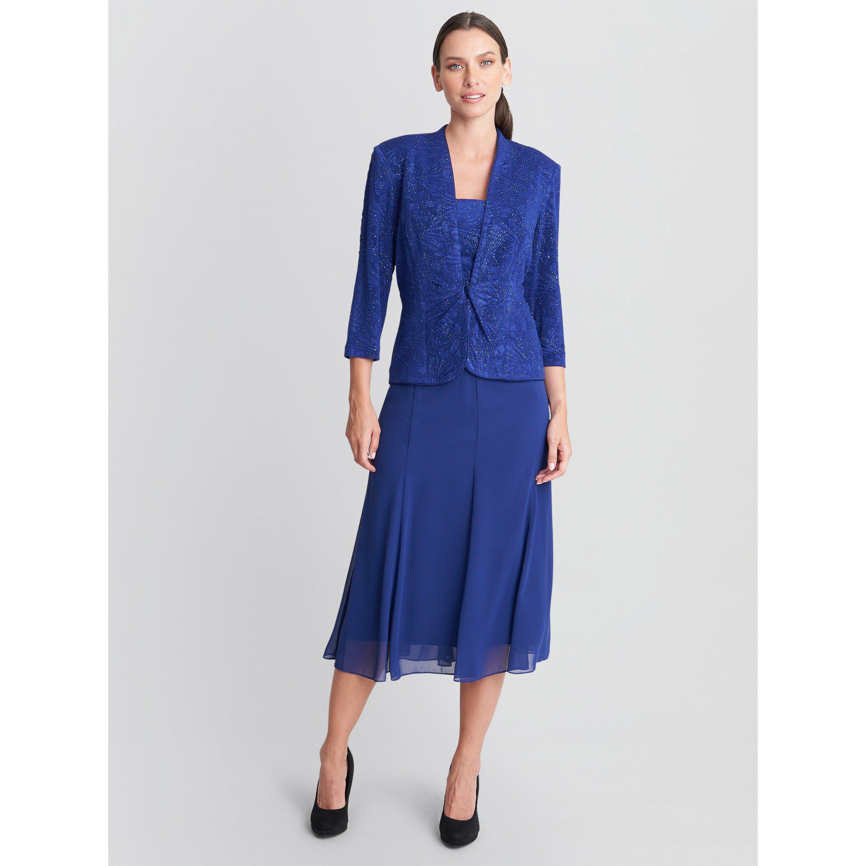 With the look of a three-piece ensemble and the sophisticated ease of a dress and jacket, this midi-length chiffon dress is topped with a embellished detailed bodice and matching jacket. The jacket offers the ideal coverage for ceremony while the sleeveless dress is perfect for reception dancing! The perfect choice for Mother-of-the-Bride (& Groom) or for wedding guests!
