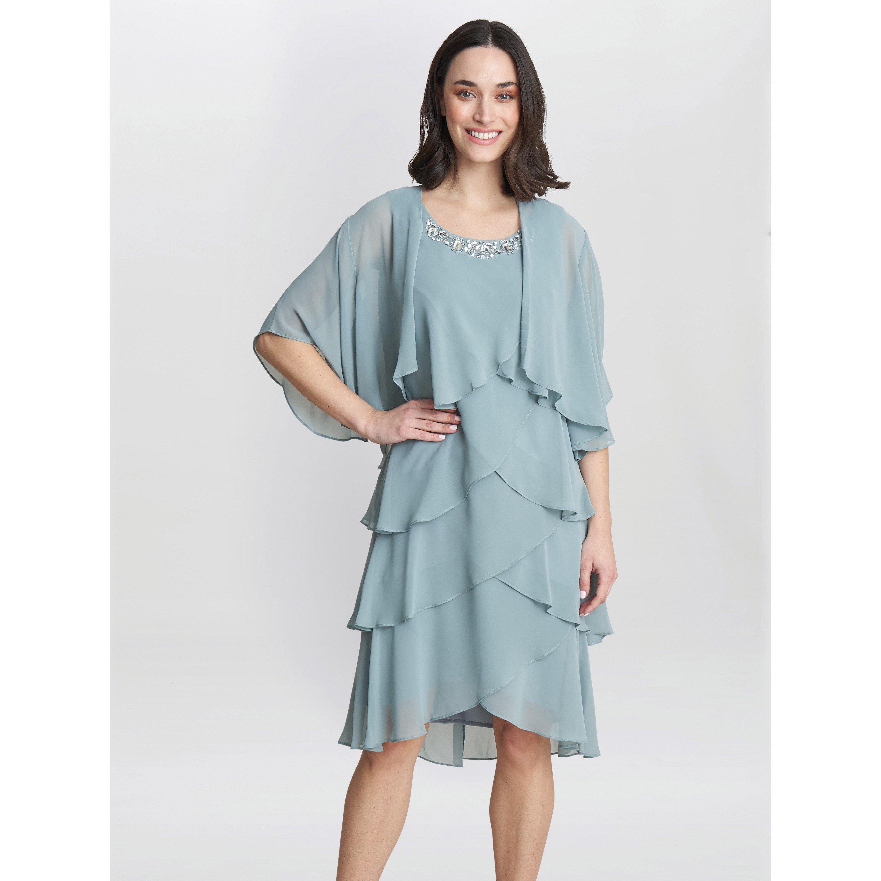 Complete with a sheer chiffon jacket, this short tiered dress shines with a brilliantly beaded neckline is the perfect ensamble for any special occasion. A wardrobe essential you will wear time and time again.