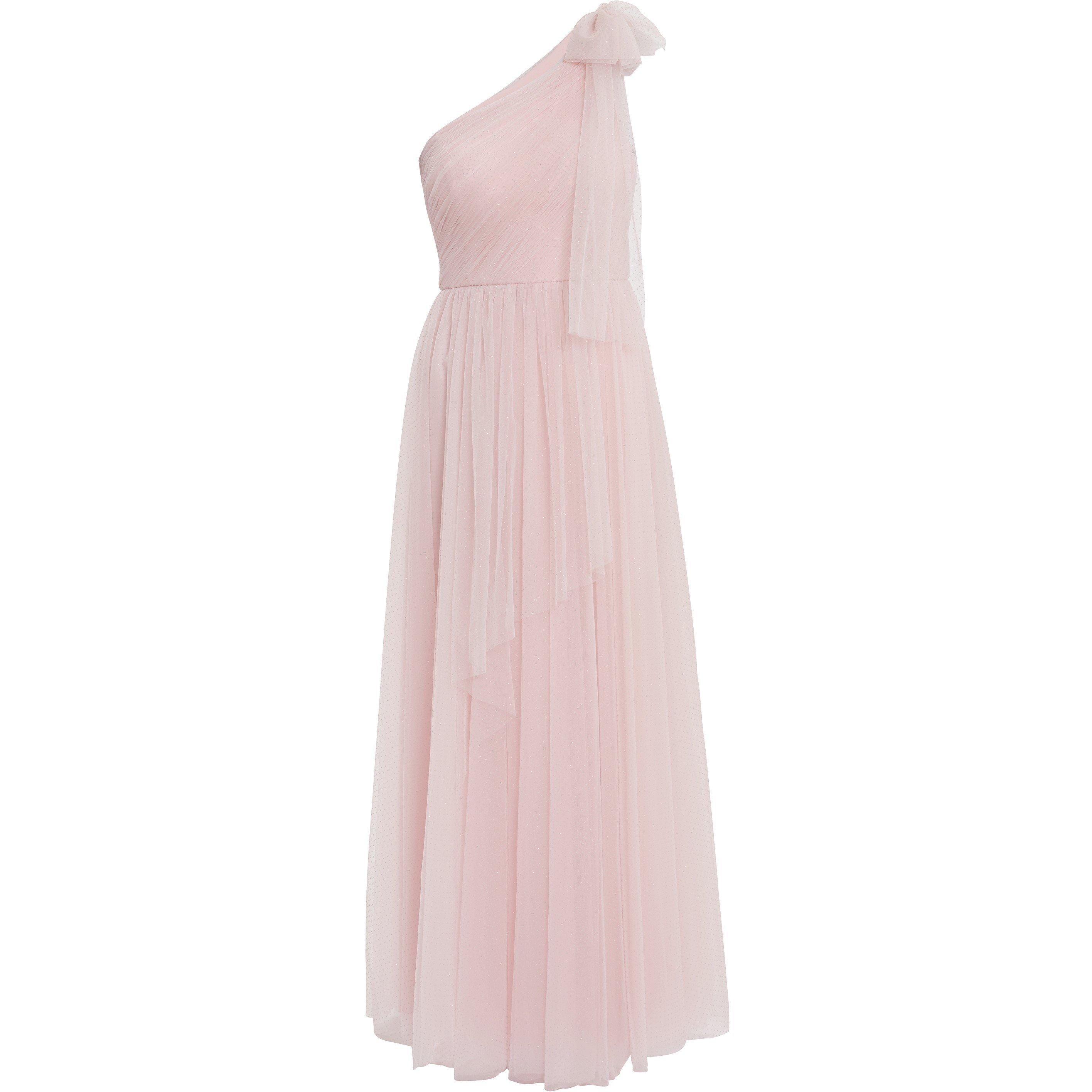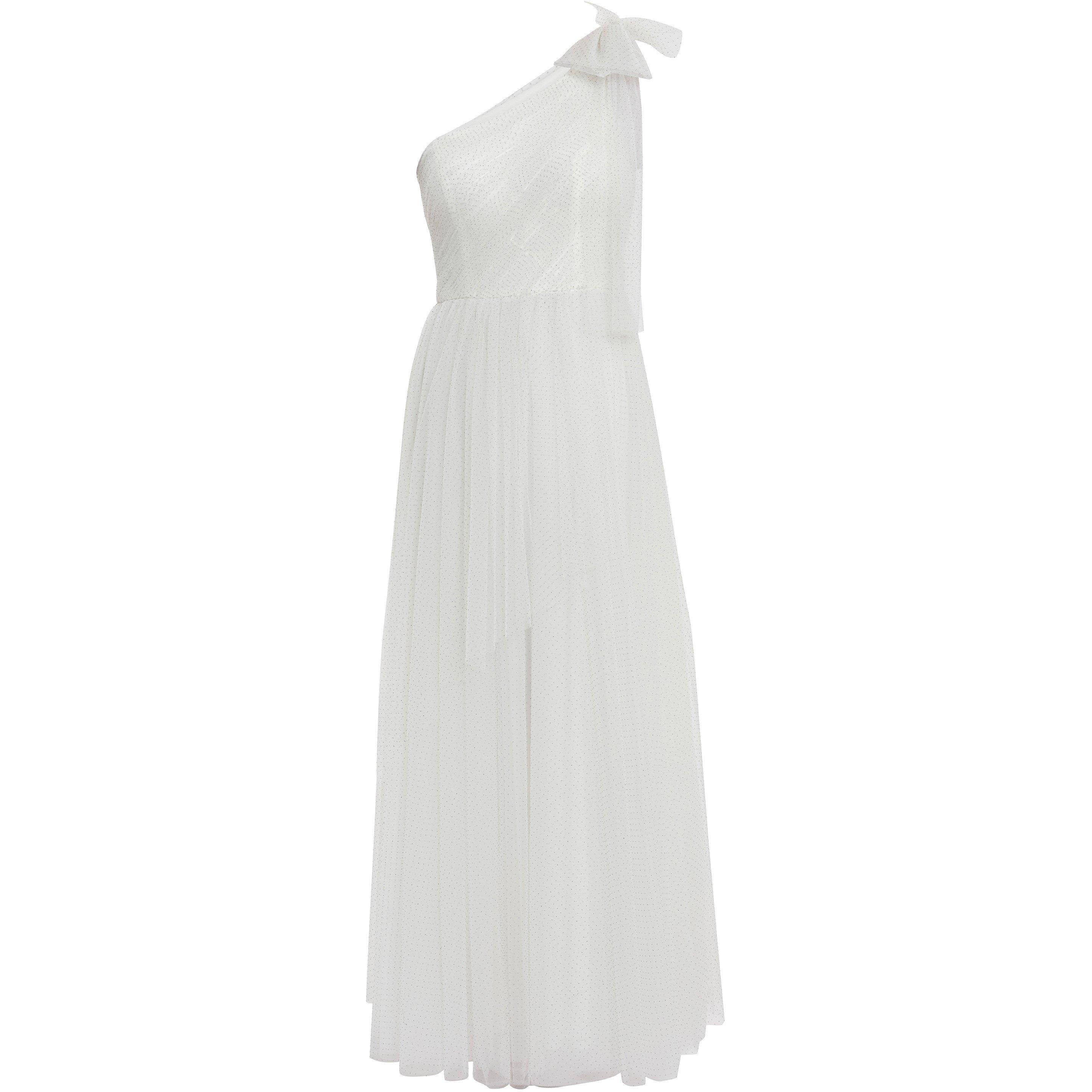 Dazzle everyone with this beautiful Gina Bacconi dress. This dress is fashioned from a metallic spot Tulle which flows gracefully as you move. The dress features a sultry one shoulder neckline with bow detailing on the shoulder for added elegance. The dress is fully lined and is fastened with a concealed side zip and hook and eye detailing.