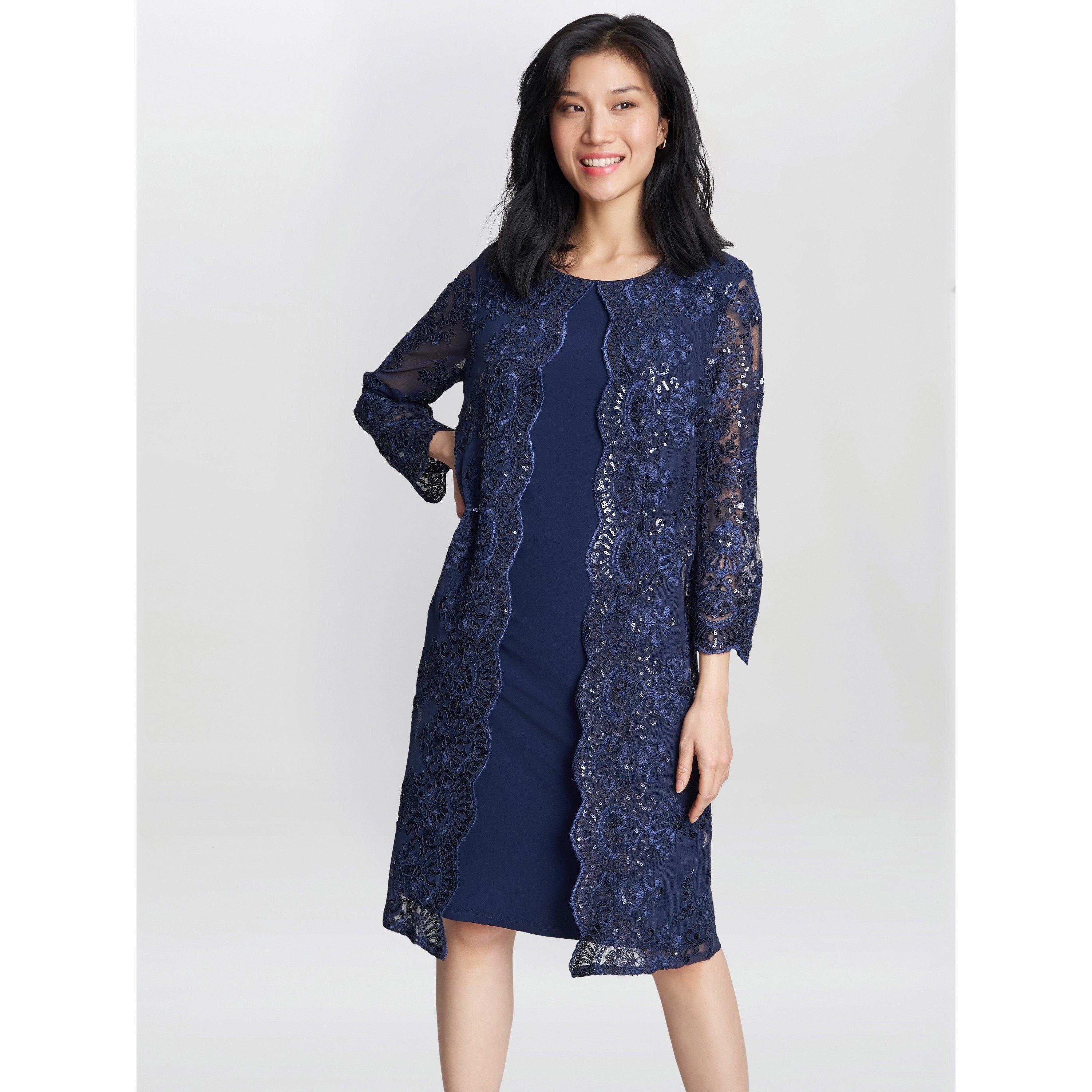 This perfect occasionwear piece, a classic shift dress overlaid with a detailed floral lace and strewn with light-catching sequins. The lace features a scallop lace which adorns the front of the dress and the sleeve edge. The dress is fully lined and fastens using a concealed back zip.