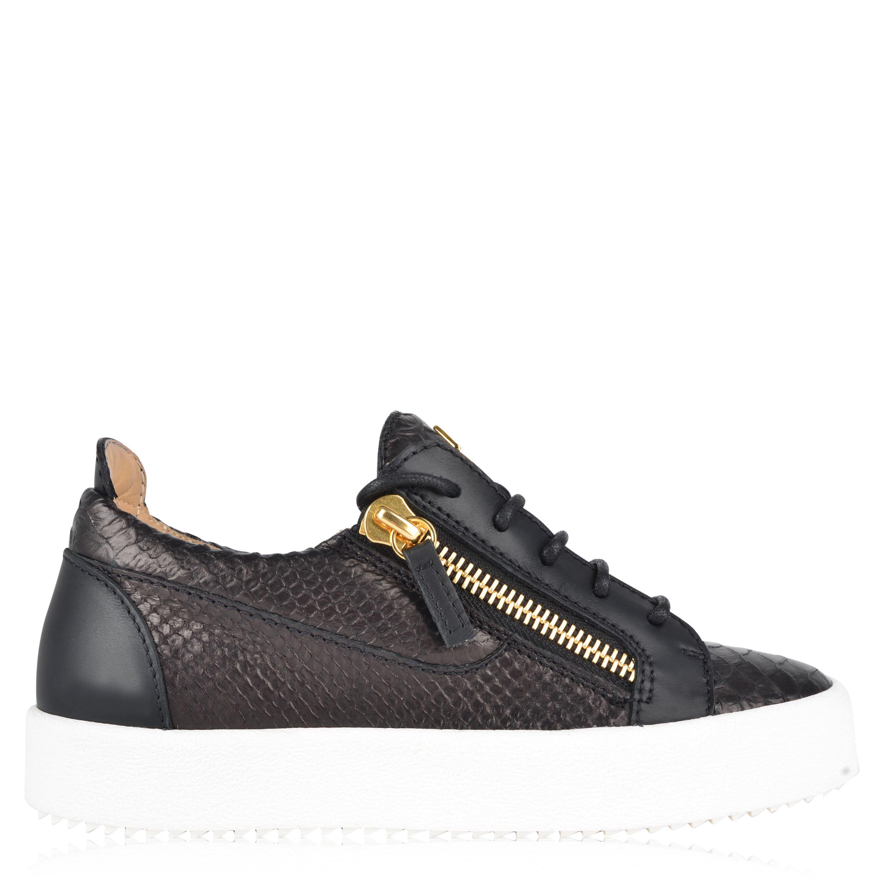 Refine your casual footwear collection with the Python embossed trainers by Giuseppe Zanotti. Made in Italy, this particular style features an embossed mock snake printed upper with the brand's signature double sided gold-toned zip up details. Designed with a tonal lace up closure, white ridged rubber sole with logo, leather inserts and lining, this pair is stylishly finished with iconic logo branding to the tongue.