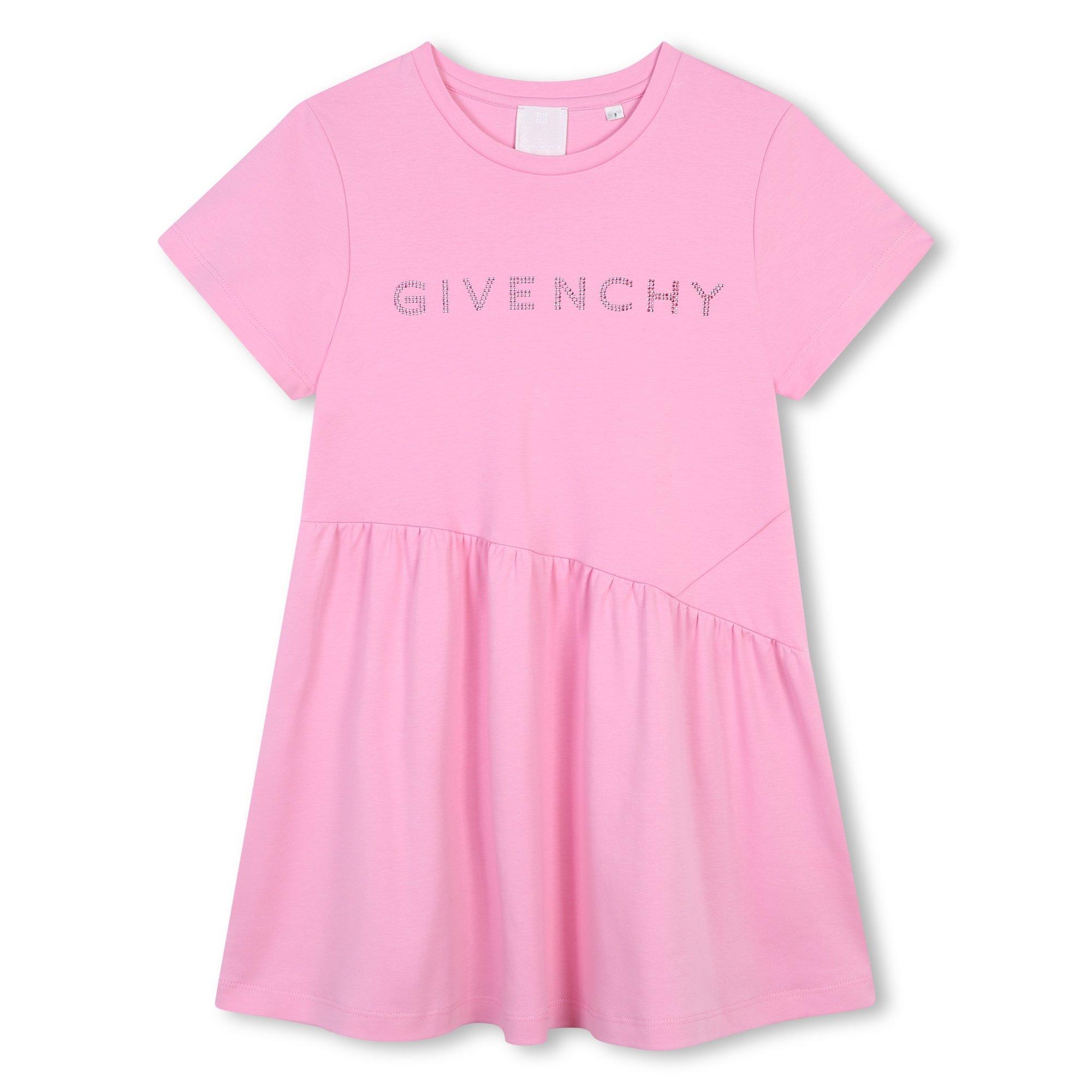 Celebrated for its exquisite craftsmanship and timeless sophistication, Givenchy presents the Rhinestone Logo T-Shirt Dress- perfect for your young fashionista. Crafted in a soft jersey fabric, this fit-and-flare dress comes with a classic round neck and short sleeves to frame her silhouette. The asymmetrical waistline leads to the flared skirt and offers a modern twist to a classic design.