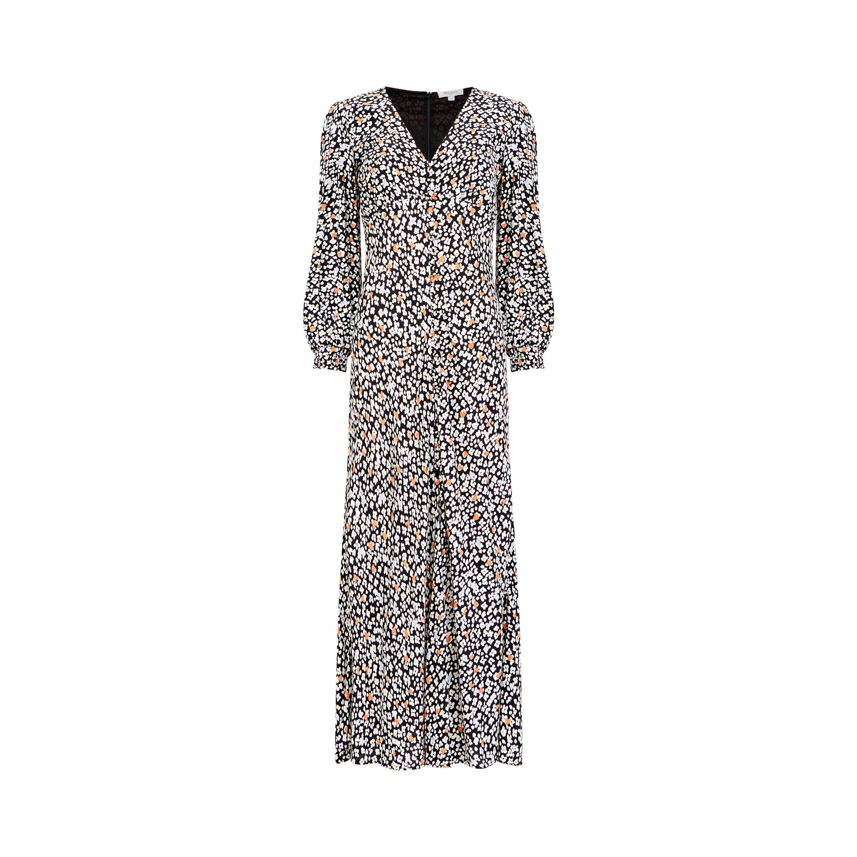 The Heart Print Midi Dress from Great Plains offers fine tailoring with a charming visual appeal. Designed with a flattering midi-length cut, this dress showcases the heart pattern.