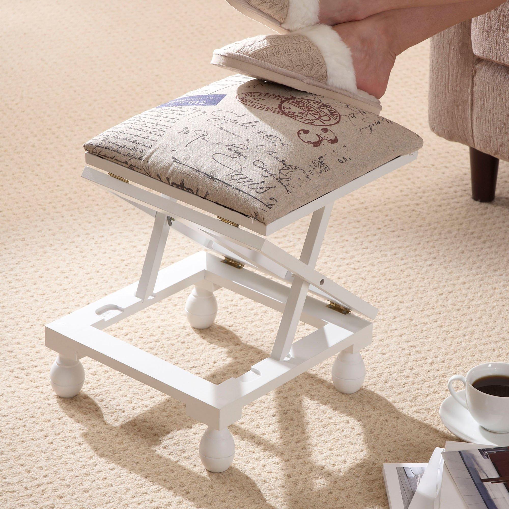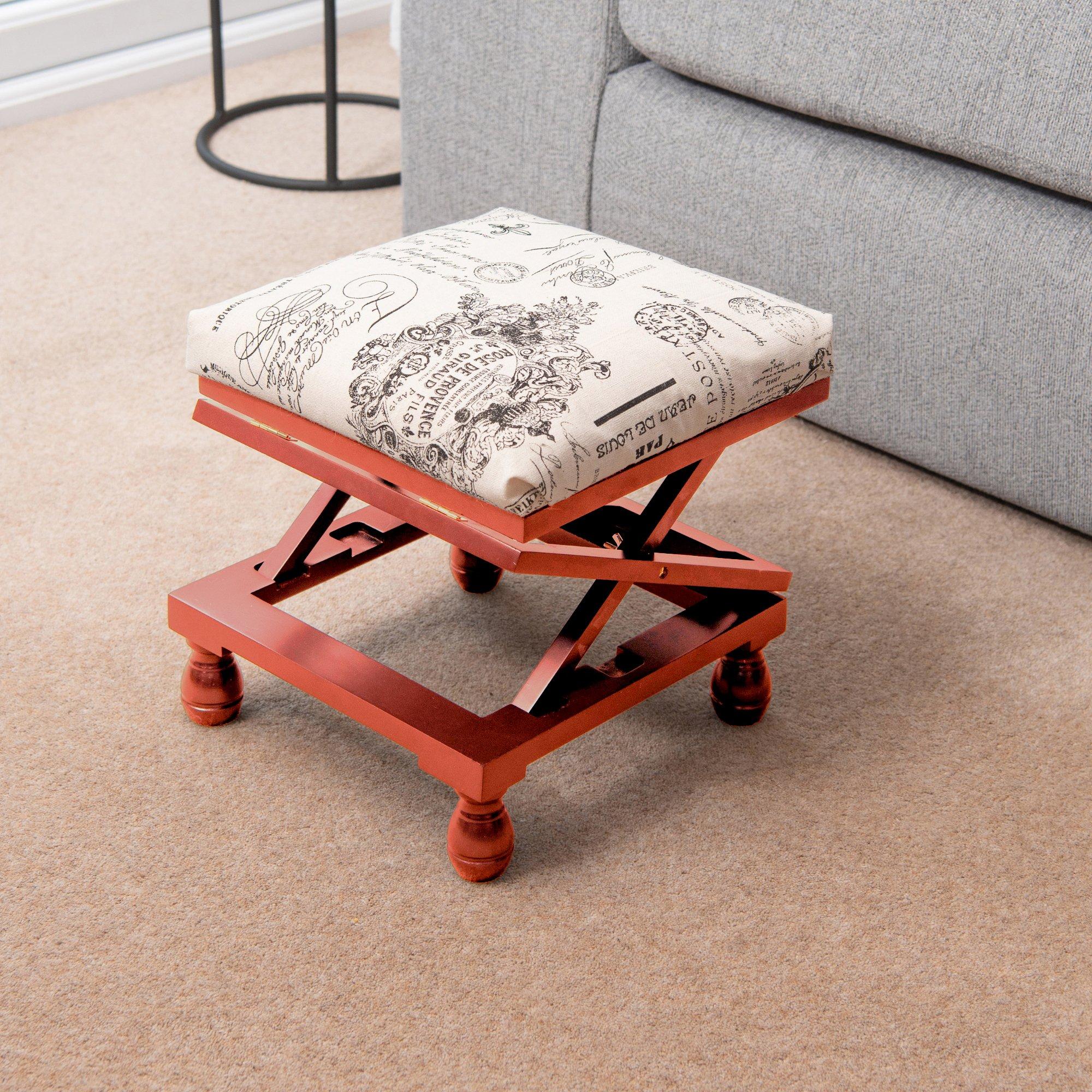 Attractive 3-position footstool made from solid wood with a printed polyester fabric covered padded top. Factory assembled frame and supplied with screw-in turned wooden bun feet with protective pads affixed to base. Adjustable supports allow a choice of height positions - 20, 32 & 39cm supplied in either a modern white or mahogany.
