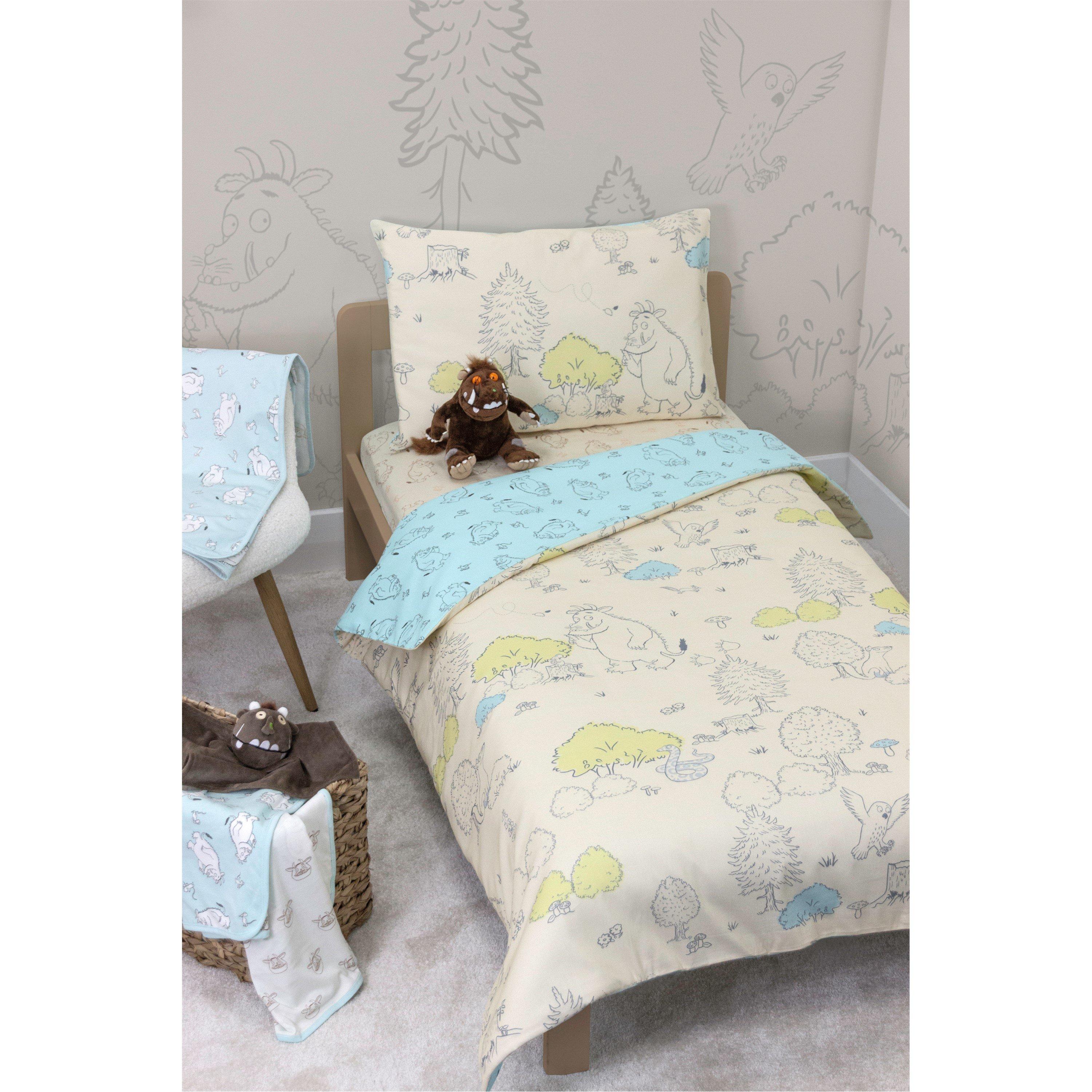 Loved by children of all ages, The Gruffalo is friendly, fun and charming! Officially licensed by The Gruffalo, the My First Junior Cot Bed Duvet Cover and Pillowcase set is perfect for young children, and makes for a great gift. The My First Junior Bedding set includes a reversible duvet cover and reversible pillow case, designed to fit your child’s cot bed, toddler bed or junior bed. One side of the duvet cover features a pencil-style repeating pattern of The Gruffalo, Mouse, Fox and Owl walking in the woods, set on an off-white background with a matching pillowcase. The reverse side of the duvet cover features The Gruffalo, Owl, Snake and Fox, with leaves and toadstools set on a blue background, with a matching pillowcase. This children’s duvet cover and pillowcase set is designed for cot beds and junior beds and measures approximately 120 x 150cm, with a 62 x 42cm pillowcase. The bedding set is made from 100% responsibly sourced cotton so it’s kind to young skin, and sealed with poppers so it’s easy to remove and wash in case of accidents. The My First Cot Bed Duvet & Pillowcase set is washing machine safe at 40°c and is tumble-dry safe at low temperatures