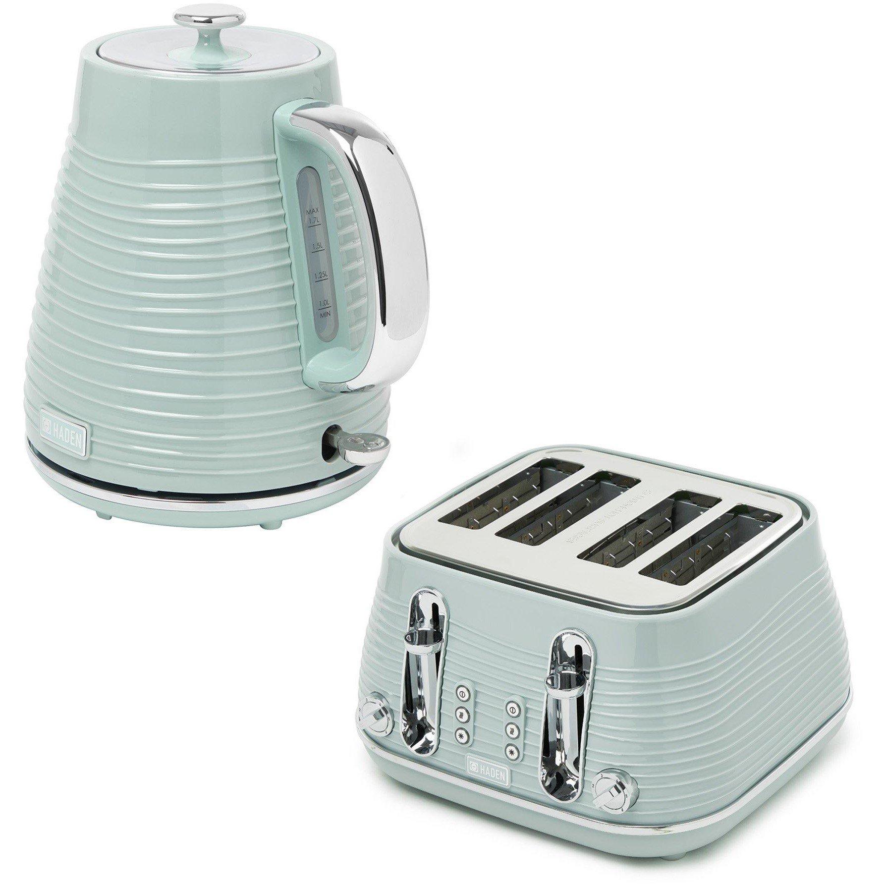 The Haden Devon collection is inspired by the coastline of Devon with its stunning sea hues and the rolling texture of the waves. The Devon Eucalyptus Twin pack consists of 1.7lt Jug Kettle & 4 Slice Toaster: The Devon 1.7 litre Jug Kettle has a pull top lid giving it a wide opening for an easy fill with a smooth, perfect pour spout. This lightweight kettle with its ergonomic handle, makes it easy and comfortable to pick up and pour. Energy efficient, only boil the amount of water you need using the markers on the clear water window. , 1.7L Capacity , Plastic Body , Power: 3000W , Voltage: 220-240V , Weight: 1.14KG , Inner / Outer: 1/6 , Warranty: 2 Year The Devon 4 Slice Toaster has wider than average slots with 6 levels of browning control. You can toast a range of breakfast foods, including thick,cut bread, buns, and crumpets. Designed for everyday use the Haden Devon 4-Slice toaster has re-heat and defrost functions, whilst the removable crumb trays allow easy cleaning. , 4 Slices , Defrost / Reheat / Cancel , 6 Heat Settings , Plastic Body , Power: 1630W , Voltage: 220-240V , Weight: 2.25KG , Warranty: 2 Year