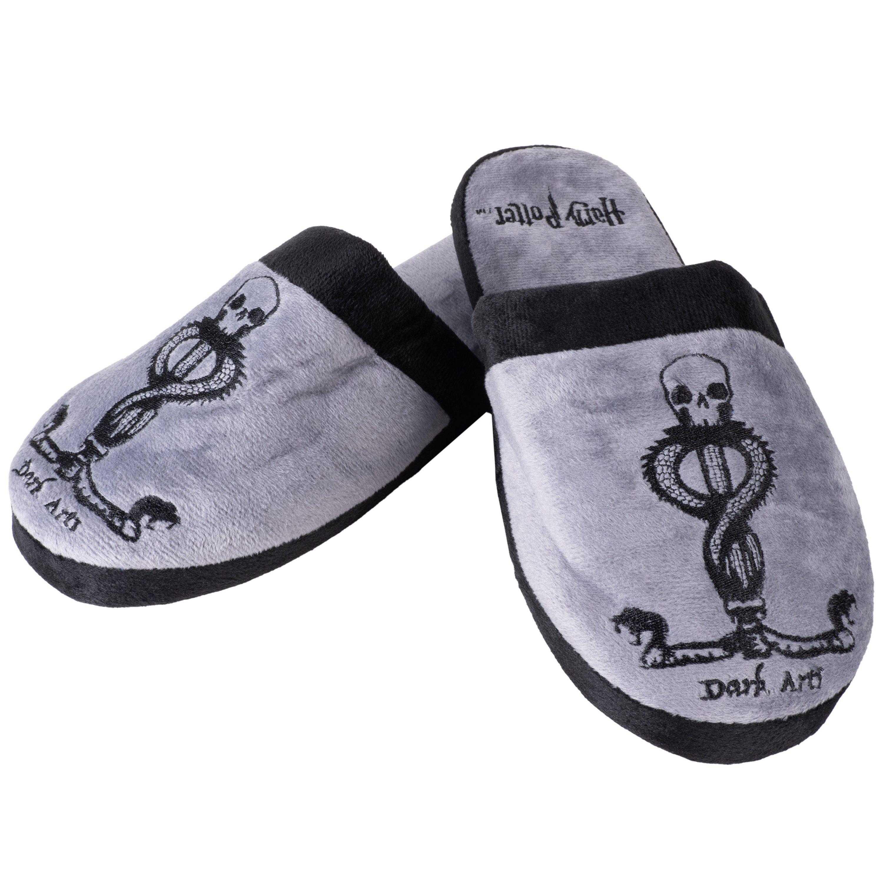 Sit back and relax after a hard day at Hogwarts in your cosy Dark Arts logo slippers!