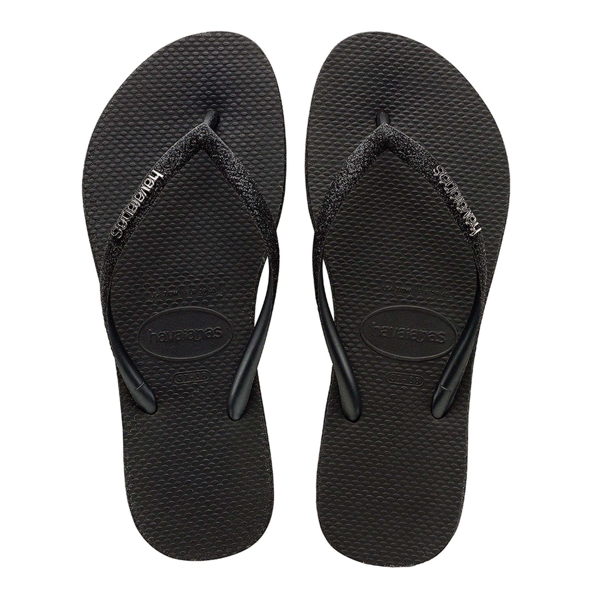 Havaianas iconic Slim flip flop shape, with a glamourous glitter detailing on the straps and outsole. Make your summer outfits shine.