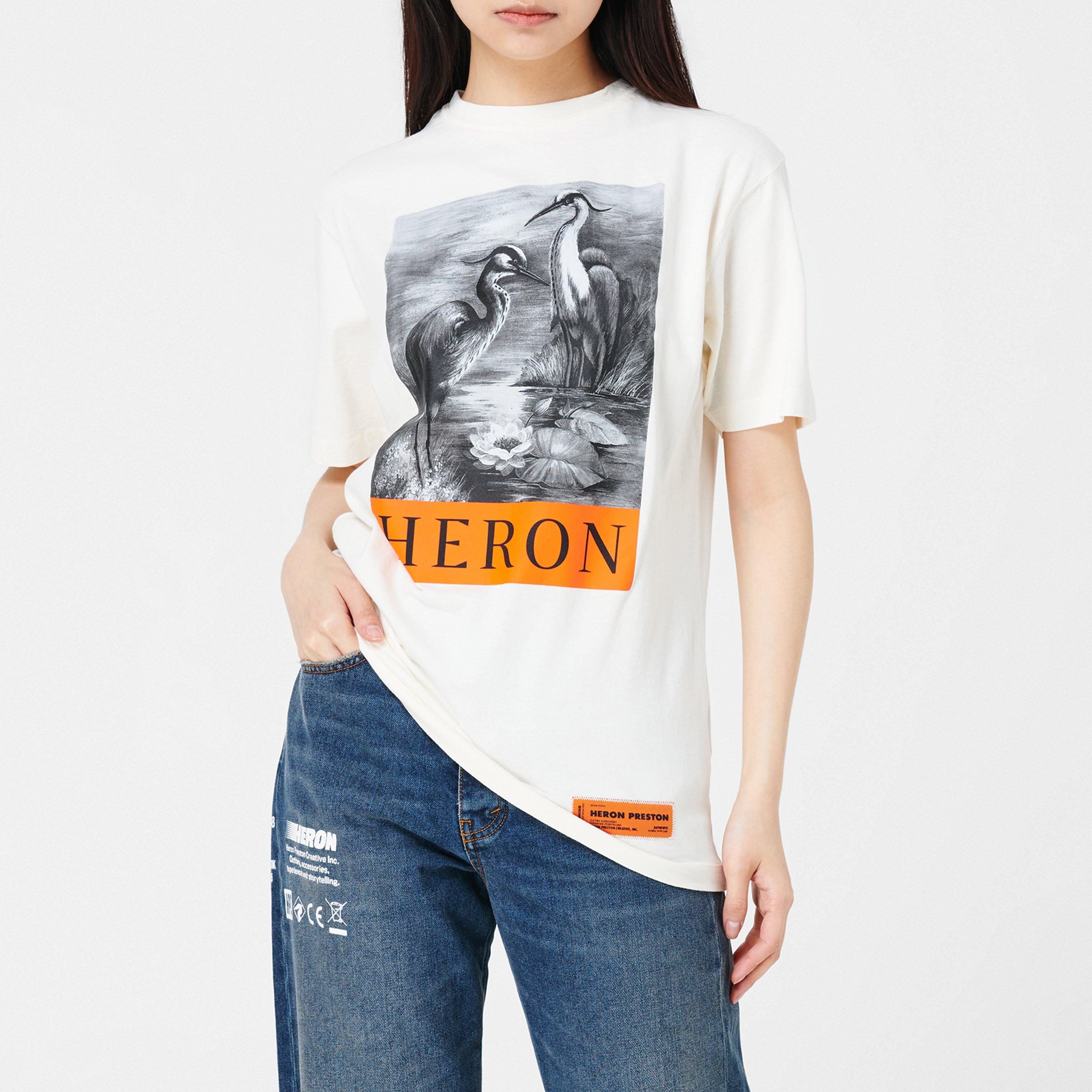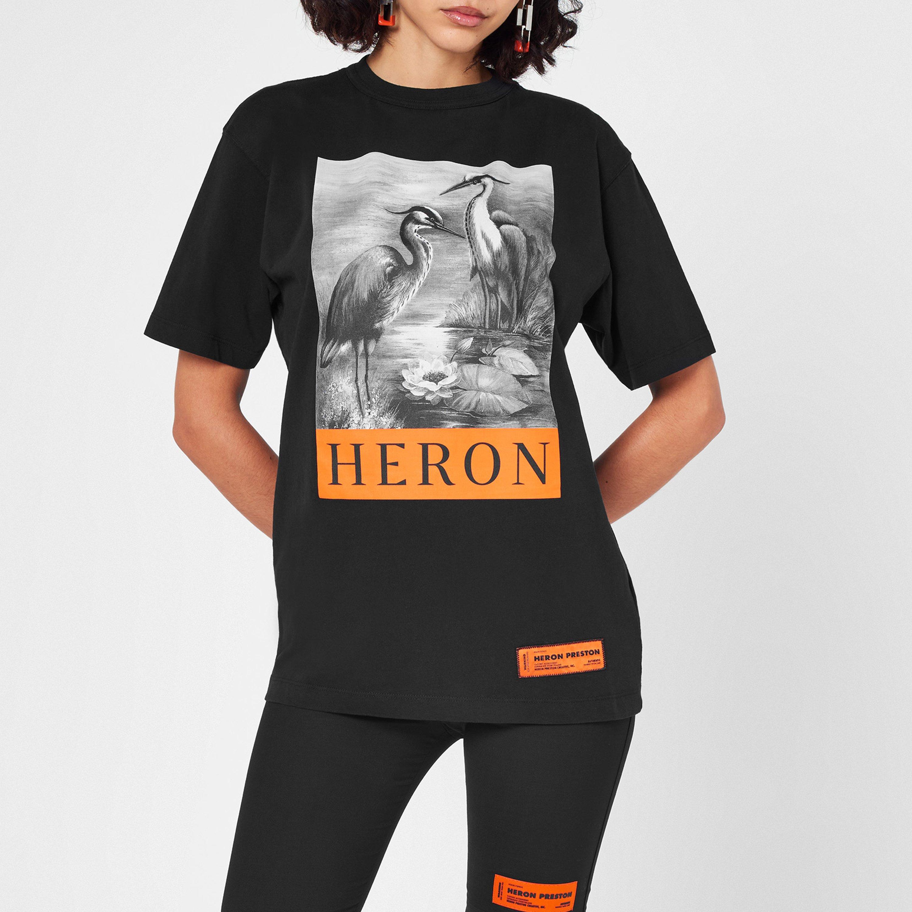 - Soft Refresh your wardrobe with the Oversized Logo T Shirt from Heron Preston. Crafted in a soft cotton construction, this t shirt is cut in an oversized fit and features a ribbed crew neckline, short sleeves and elasticated trims for comfort. The look is finished with the brand's logo printed to the front and a branded patch to the hem for brand recognition. Fabric / Rib: 100% cotton. Detail: 100% polyester. Machine washable at 30 degrees.