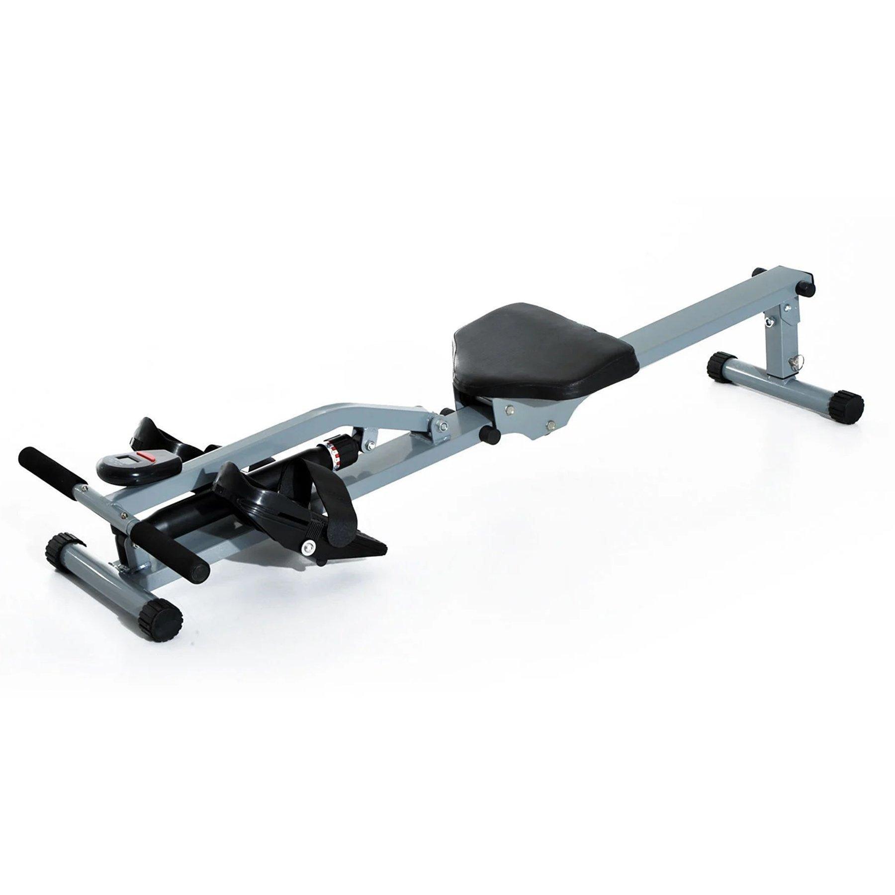 Features: With multi-level adjustable resistance for various workout levels Full body exercise targets all major muscle groups: legs, arms, back, abdominal and hips and more with additional exercises Made from a metal frame for added strength and stability LCD console displays Time, Count, Calories, Total Count and more Choose the scan function to scroll through all functions during your workout Fully padded seat and non-slip grip handlebars for optimal comfort Large anti-slip foot pedals with adjustable foot straps Floor protectors safeguard your workout area and prevent skidding Specification: Colour: Grey / Black Material: Steel, PVC Dimensions: 130L x 47.5W x 67Hcm Length of rowing rail: 61cm Seat Size: 30L x 22W x 4Tcm Net Weight: 9.5kg Weight Capacity: 100kg