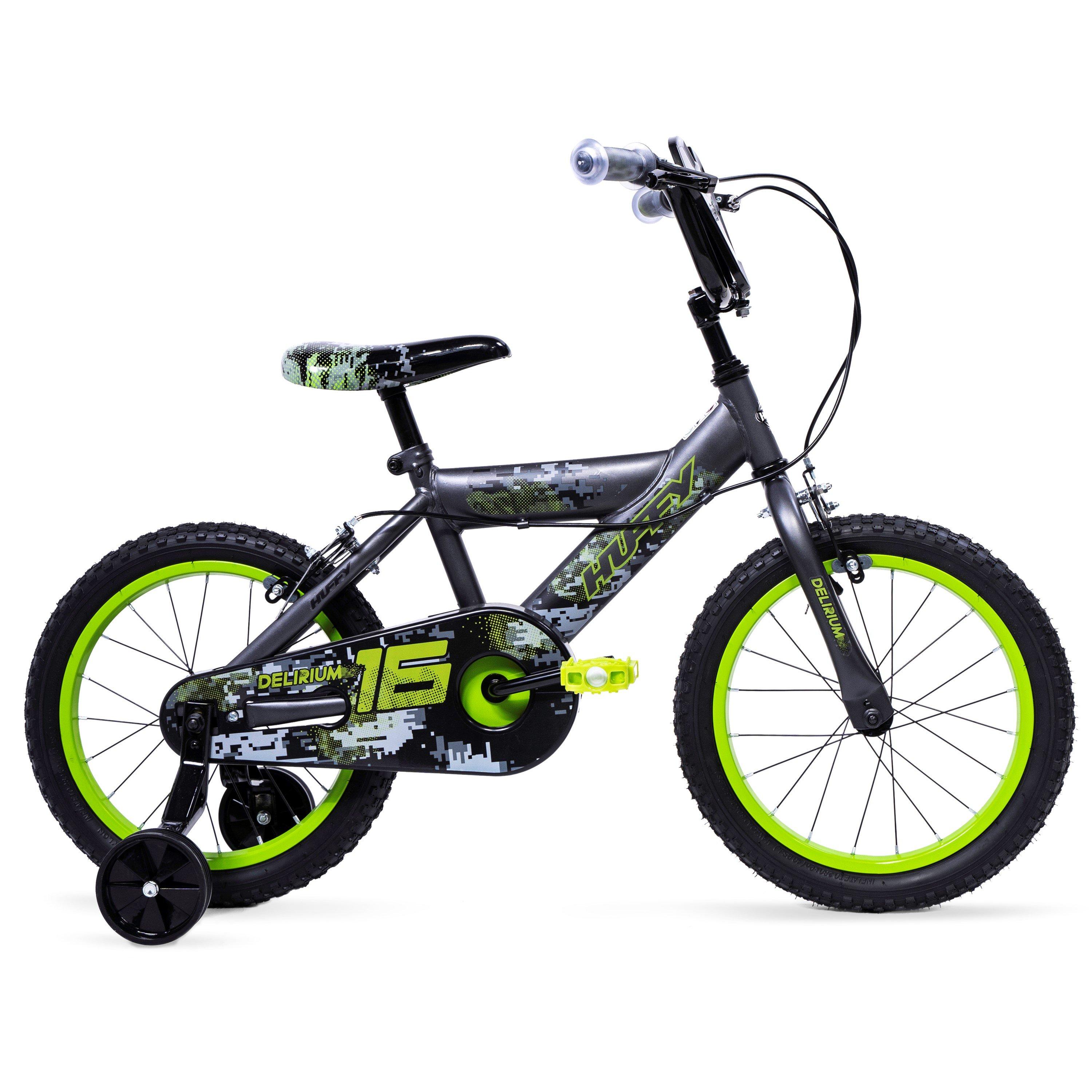 The Huffy Delirium with 16 wheels has a cool, edgy style. The matt silver frame, black graphics and racing number plate demand attention and guarantee fun!