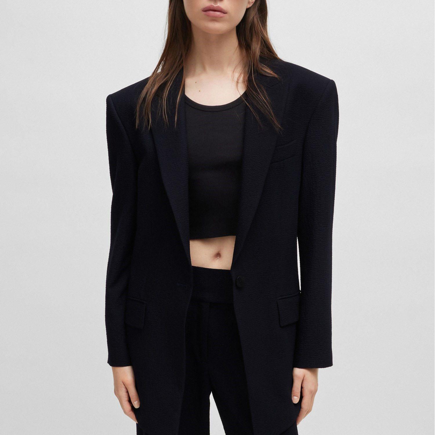 A trend-driven long-length jacket tailored to an oversize fit with a straight silhouette by HUGO Womenswear created in stretch seersucker with peak lapels.