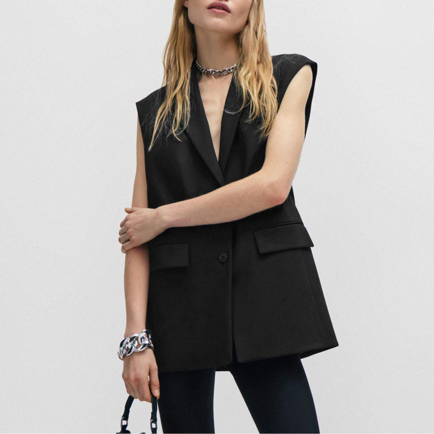 A long-length waistcoat in a regular fit by HUGO Womenswear. Featuring a single-breasted closure and wide shoulders this modern waistcoat is crafted in stretch fabric with flap pockets and notch lapels. A full lining detailed with HUGO logos completes this piece.