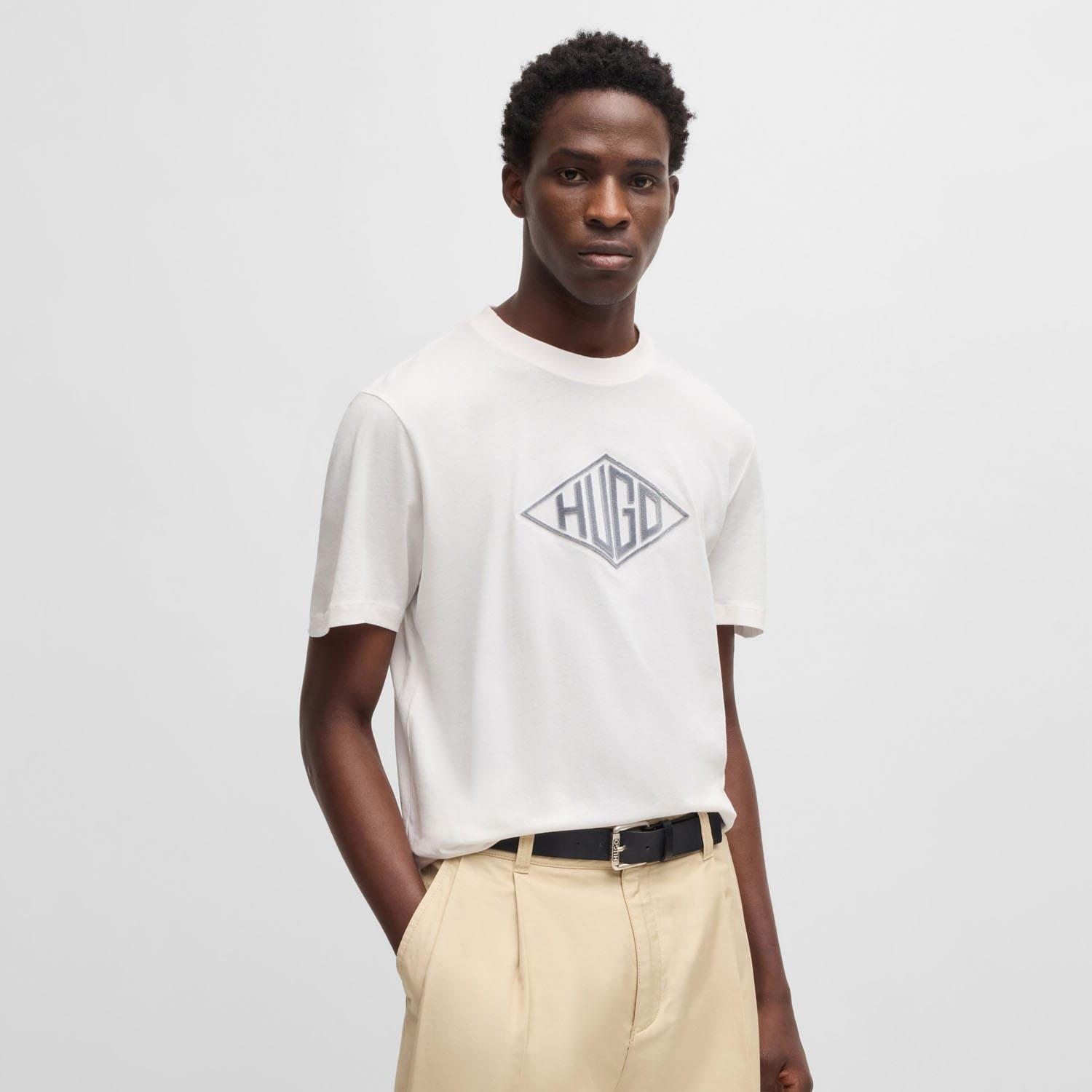 With intricately embroidered 3D branding this HUGO Menswear T-shirt elevates casual looks. Cut to a straight fit in breathable jersey.