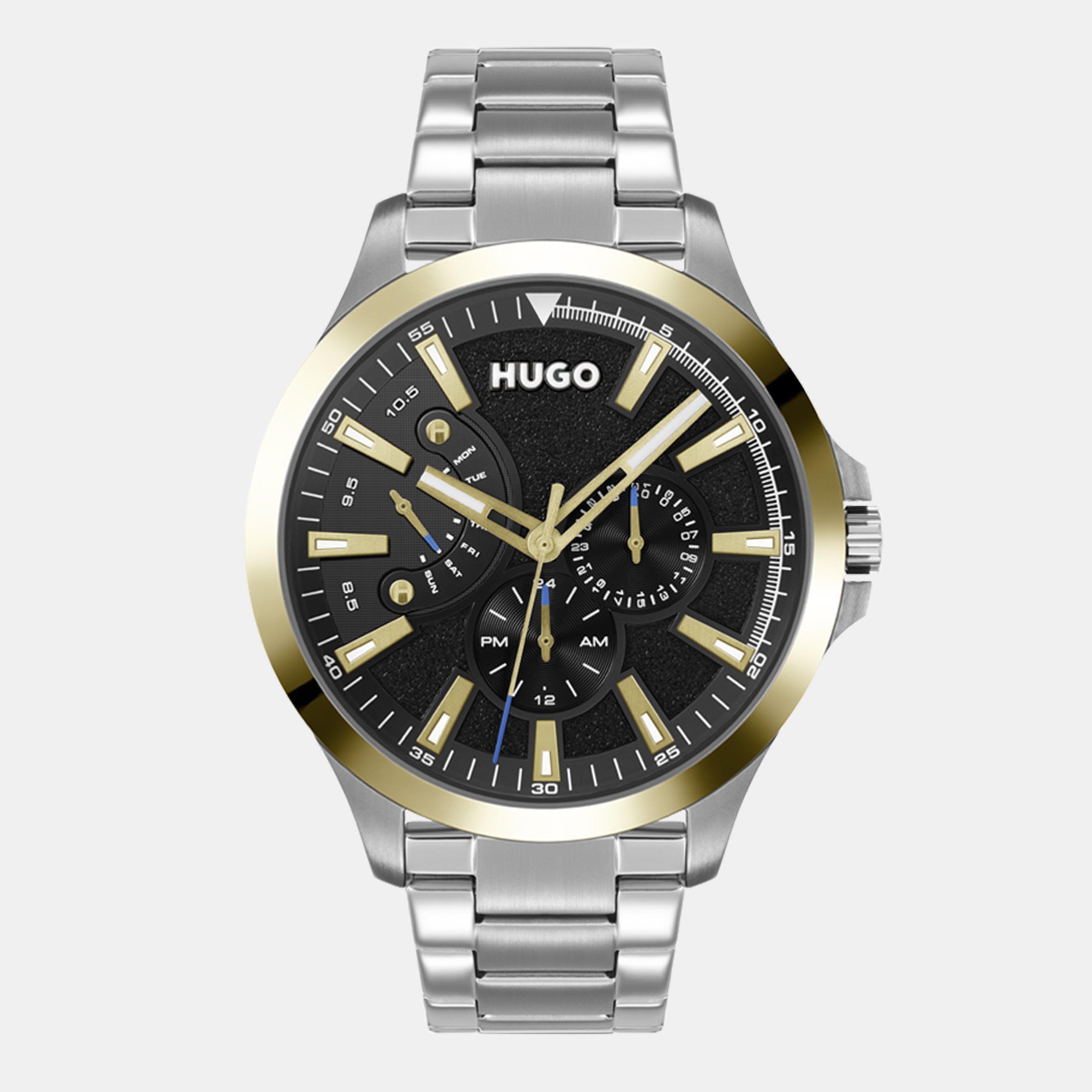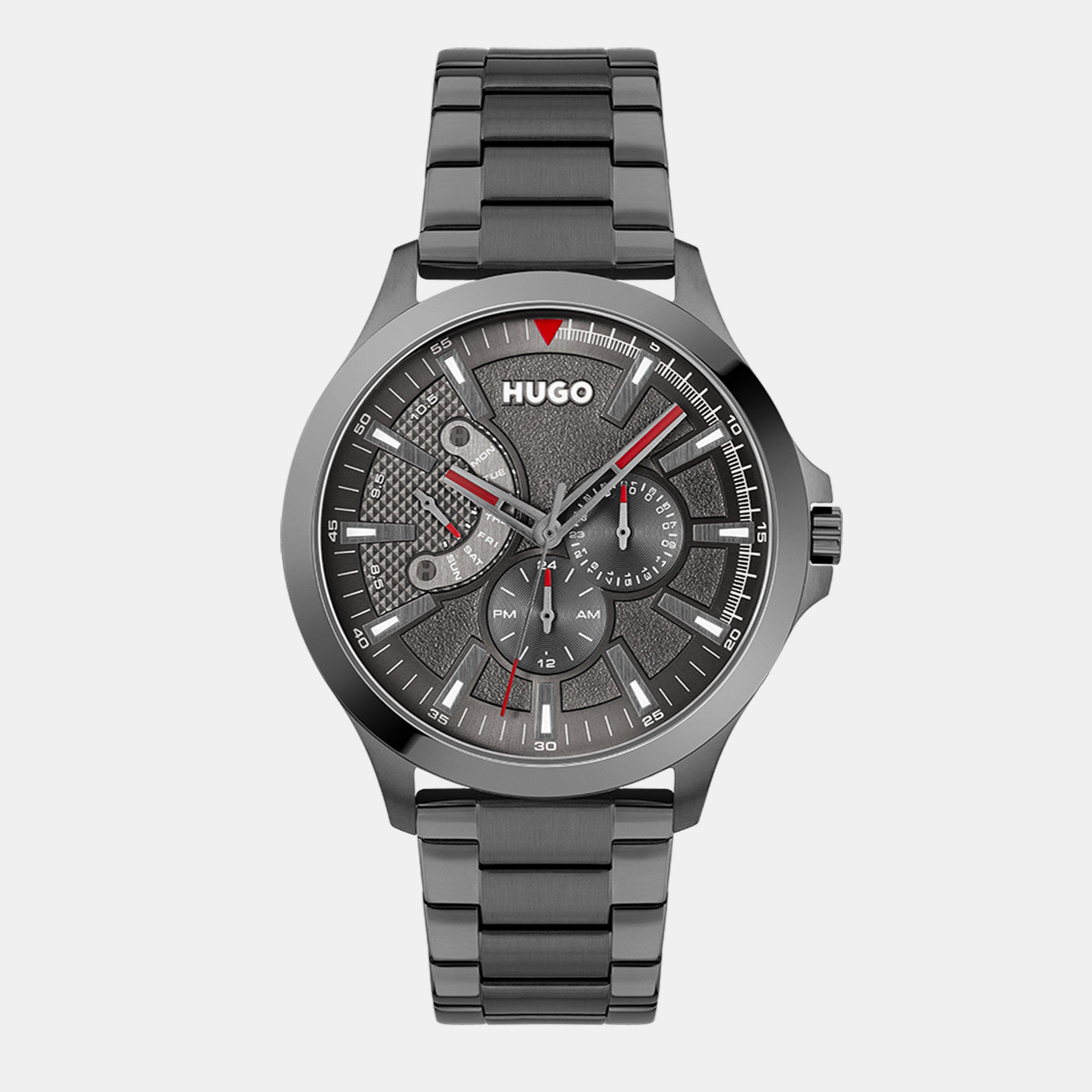 To leap is to live. Inspired by the risk-taking approach of the HUGO man, the #LEAP collection is made up of bold, multifunction timepieces. An attention-grabbing fusion of multiple design elements, the watch has a textured face detailed with oversized hour markers, tonal sub dials, bold hands, and – as a finishing touch – branded screws engraved with the letter H.