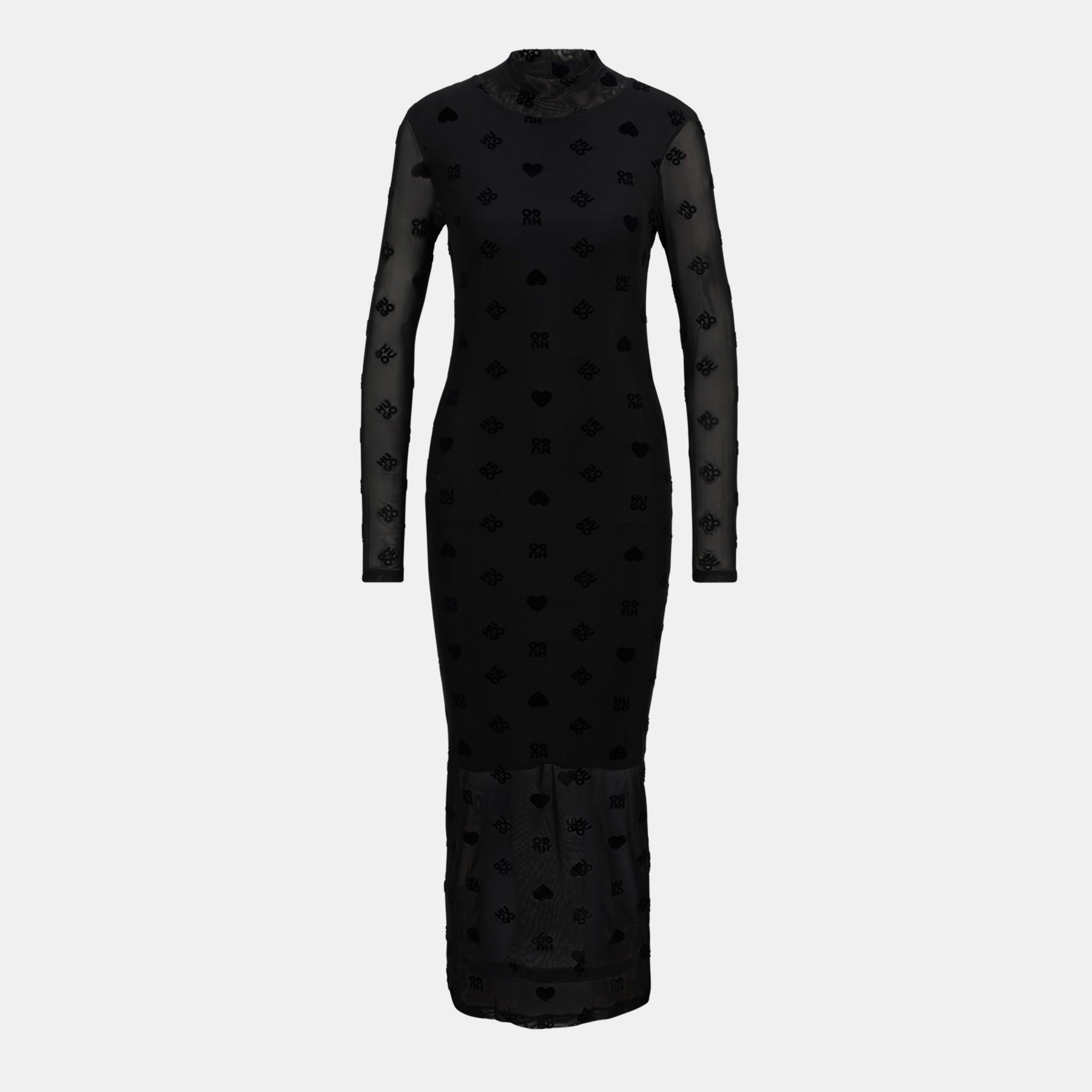 Crafted from a luxurious polyester blend, this dress features a stretch mesh fabric that ensures a comfortable and flattering fit. The straight-fit silhouette alongside the midi length is both timeless and chic, making it suitable for a variety of occasions. The crew neck and long sleeves add a touch of sophistication, while the hemline falls gracefully, creating a feminine and graceful look. The velvet all-over logo print adds a unique and stylish element to the dress, which will truly bring your outfit to life, whether styled with heels and statement jewellery or dressed down with boots and a jacket, this dress exudes confidence and refined glamour. Main Composition: 94% polyester, 6% elastane. Lining: 92% modal, 8% elastane. Care: Machine washable at 30 degrees.