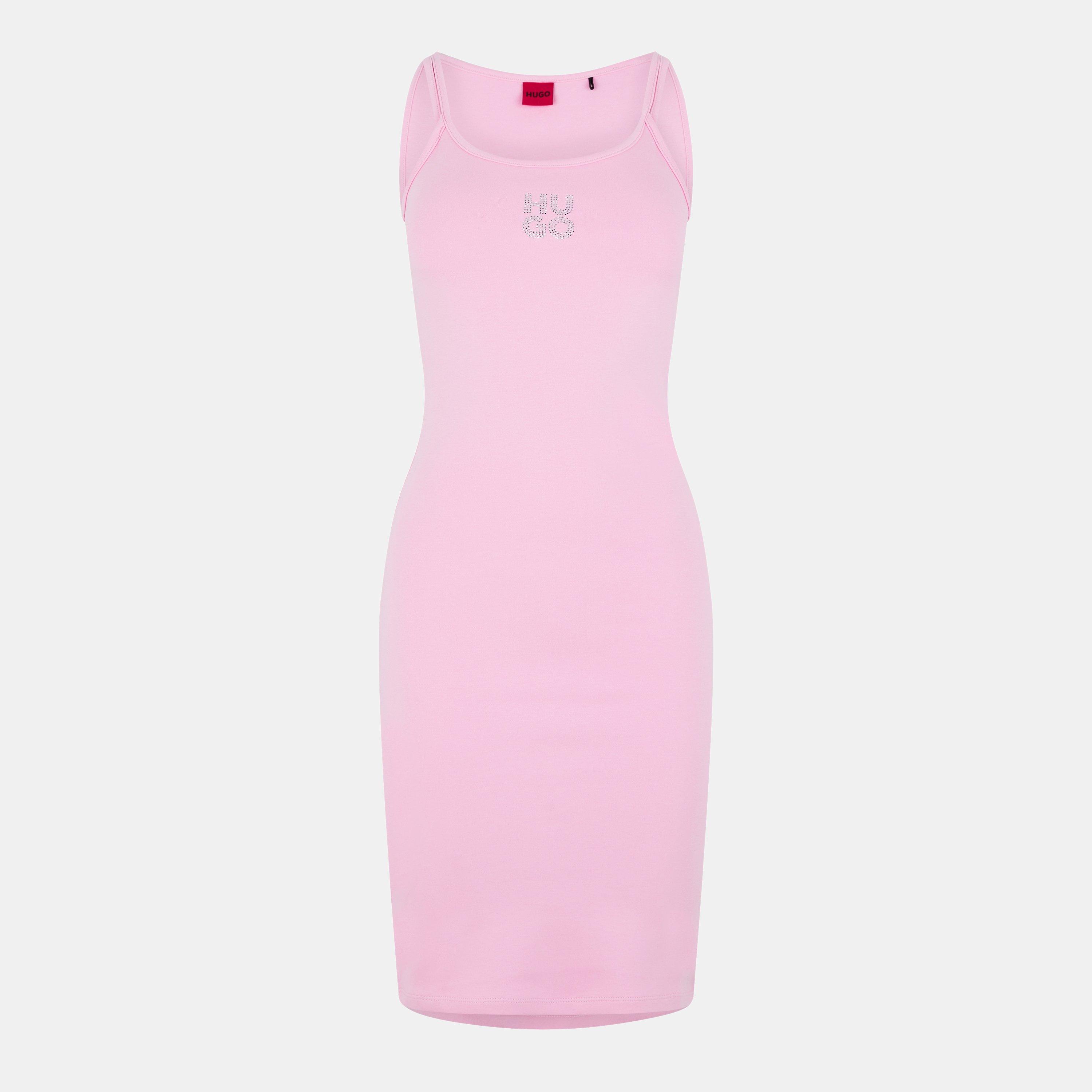 Fall in love with Hugo and their Neamea Diamante Dress, adorned with the brand's iconic logo shimmering in diamantes. A chic and effortless piece perfect for seamless day-to-night transitions, empowering wearers to make a statement wherever they go.