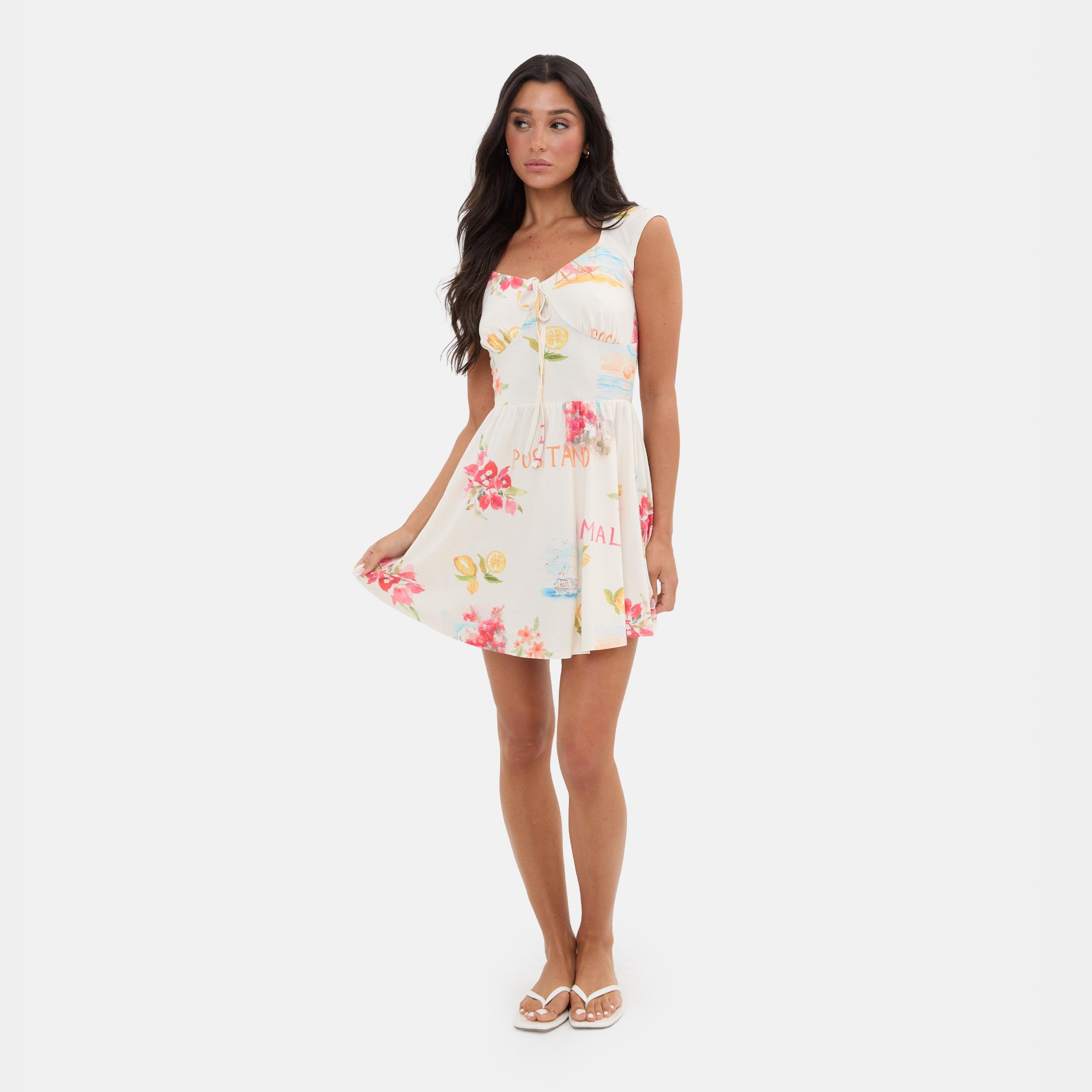 Playful and feminine, this printed tie front mini dress features a vibrant all-over print that adds personality and charm. Designed with a flattering tie-back detail and drop waist design, it cinches to create a beautifully defined silhouette.