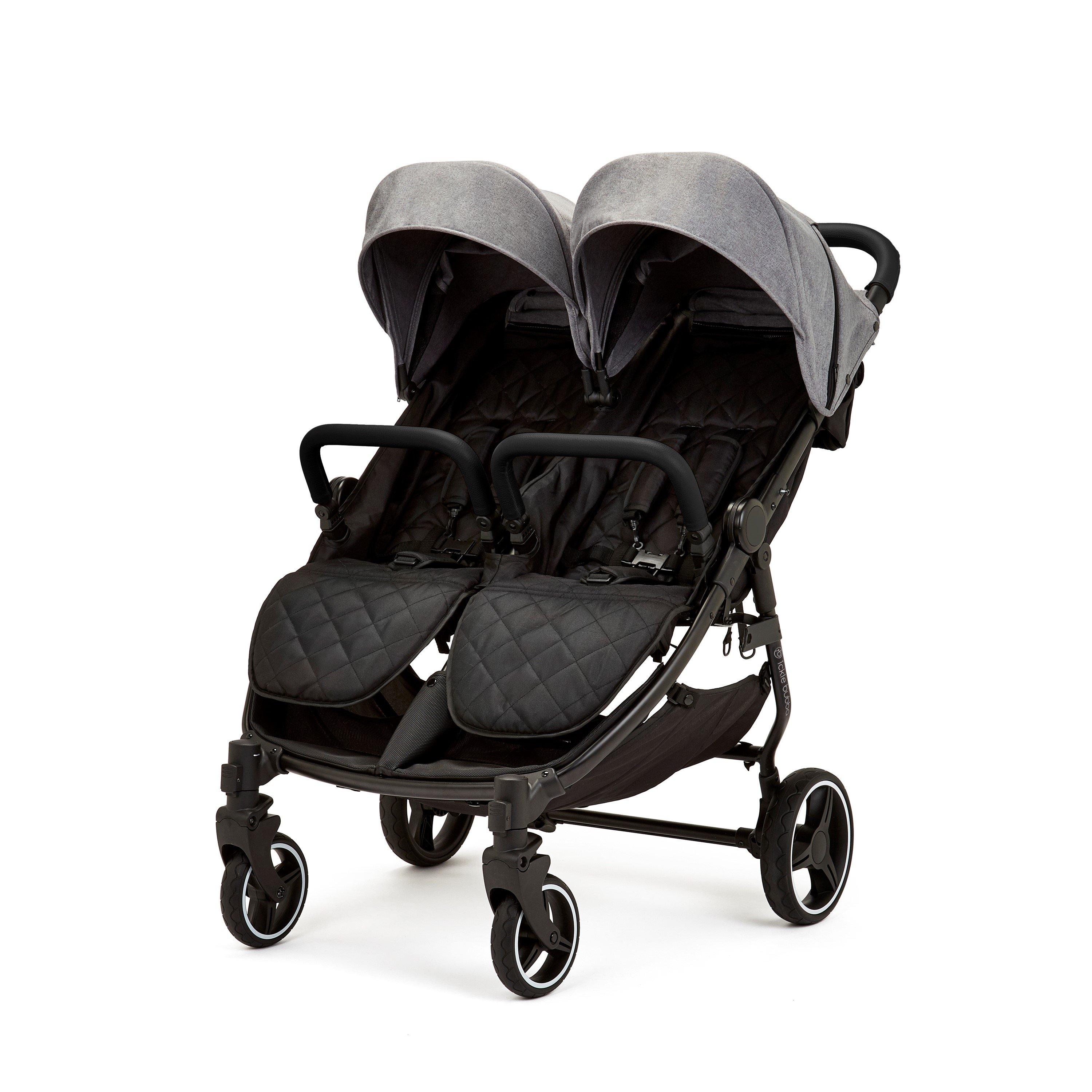 Compact double stroller | Weighs 13.4kg This compact stroller weighs an impressive 13.4kg and is packed full of enhanced features designed to make parenting easier. Its extra-large shopping basket is great for storing all those essentials, while 360 degree swivel front wheels and front and rear suspension means that it can handle bumpy terrains.