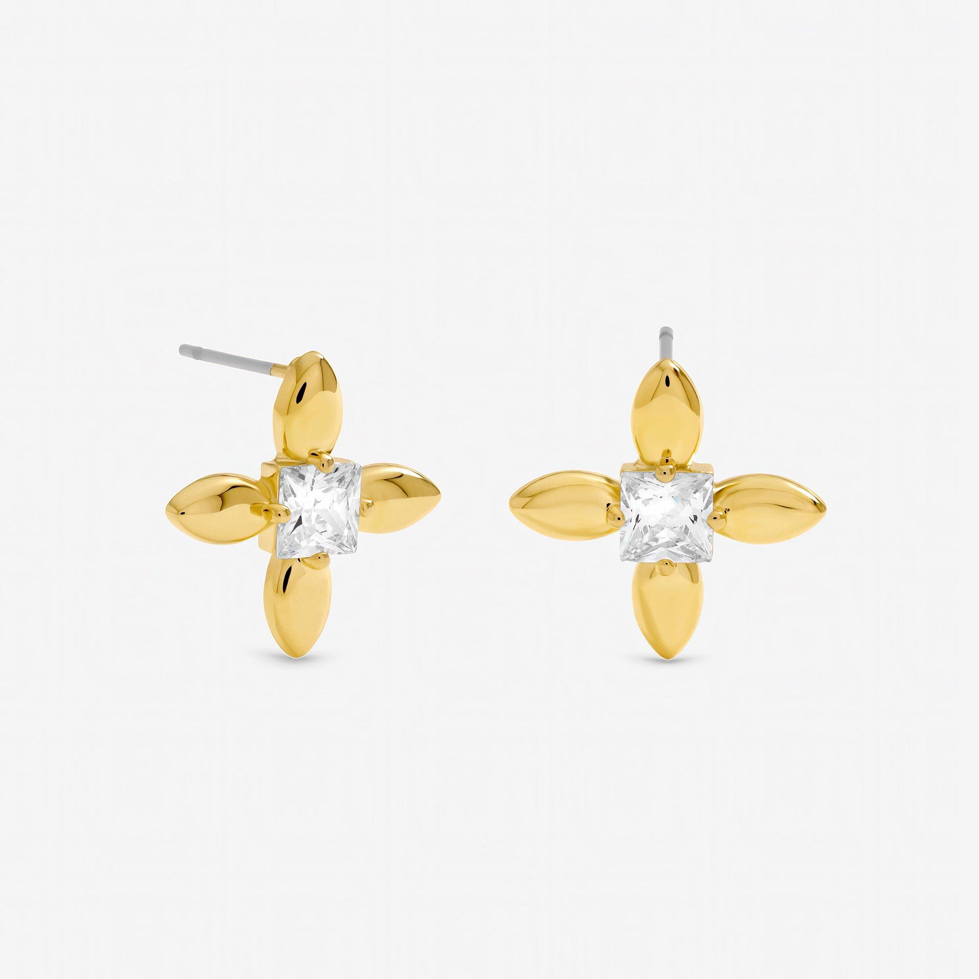 Our Inicio Gold Plated and Crystal Clover Stud Earrings are designed to bring a touch of luck to your look, adorned with sparkling crystals, these earrings are perfect for everyday and special occasions. Fastening: Post and bullet back. Width dimension: 8mm, length dimension: 8mm. Material: Gold plated base metal.