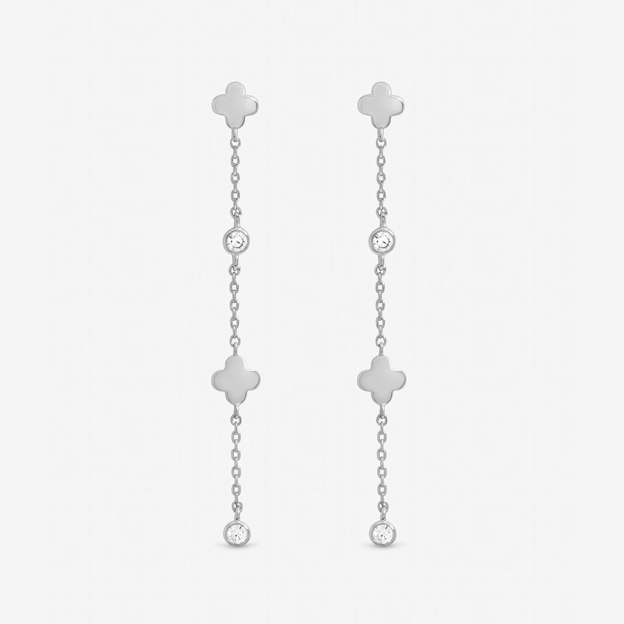 Our Inicio Crystal Clover Fine Long Drop Earrings exude understated elegance and timeless sophistication. Expertly crafted in polished sterling silver plating, each slender drop is finished with a delicate clover motif, set with a bezel-set crystal that catches the light with subtle brilliance. Lightweight and graceful, these earrings bring a refined, feminine accent to both everyday ensembles and special occasions.Fastening: Post and bullet back. Width dimension: 4mm, length dimension: 50mm. Material: Sterling silver plated brass.
