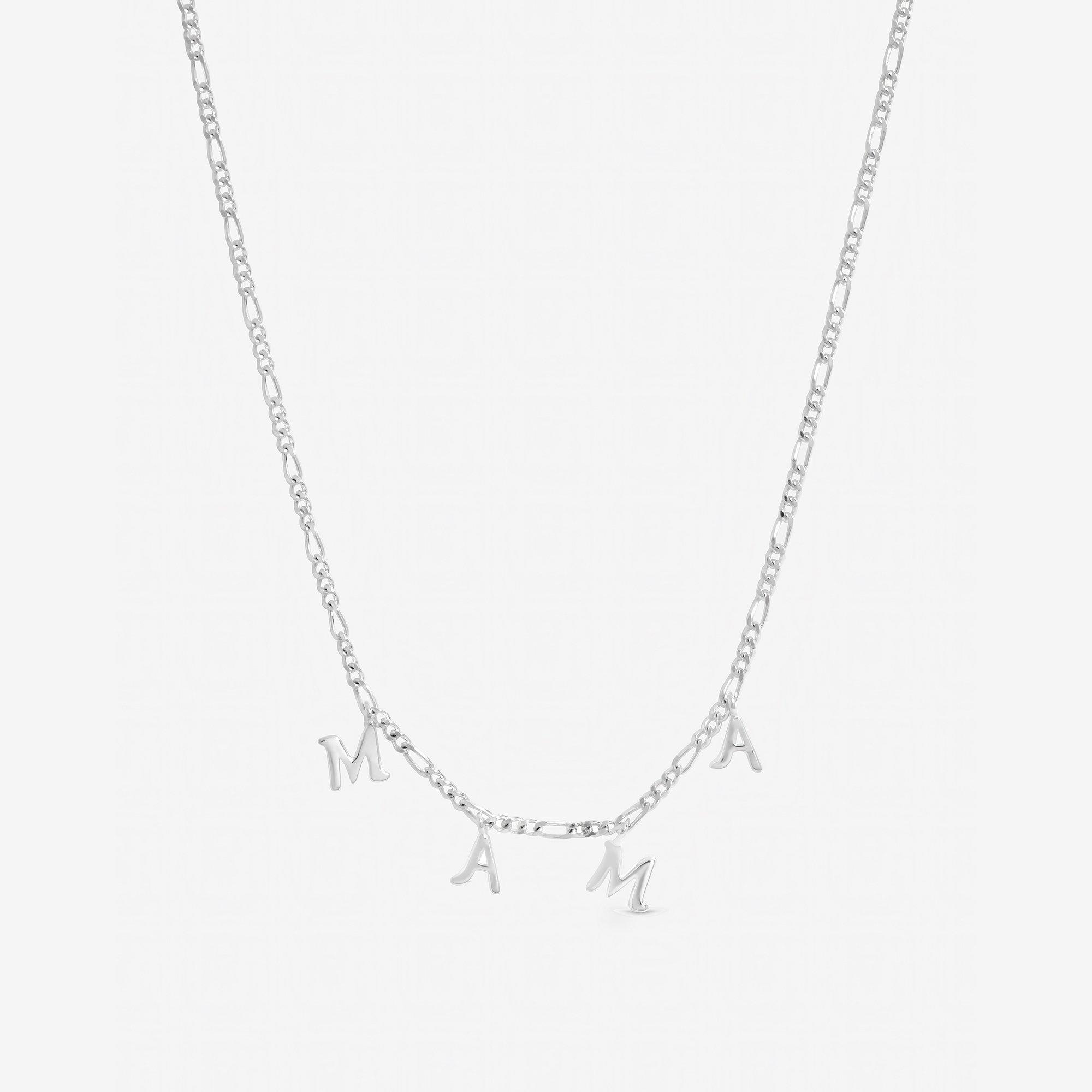 Our Inicio Mama Necklace combines timeless elegance with a meaningful touch. The polished sterling silver plated Mama necklace features letters spaced along a delicate Figaro chain, creating a chic and modern design that's both stylish and sentimental. Lightweight and versatile, it sits beautifully on the neckline, making it perfect for layering or wearing alone as a statement piece. Presented in a drawer box, ready to gift, it's the perfect way to celebrate Mother's Day, birthdays, or simply show a cherished Mum how much she means. A thoughtful keepsake she'll treasure forever. Our 3 micron sterling silver plating uses a heavy, premium layer of silver that delivers a brighter finish, greater resistance to tarnish and wear, and significantly longer lasting quality than standard plated jewellery. Fastening: Lobster clasp. Chain length: 16, extender length: 2. Width dimension: 5mm. Length dimension: 406mm. Material: Sterling silver plated brass.