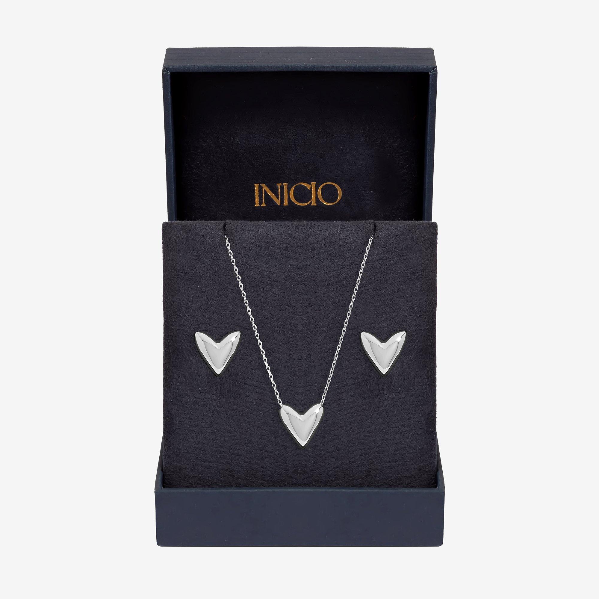 Our Inicio Puff Heart Set combines timeless charm with everyday elegance. Crafted in polished sterling silver plating, this set includes a matching pendant necklace and stud earrings, each featuring a soft, puffed heart design that catches the light beautifully. Presented in a snap shut gift box, ready to delight, this set makes a thoughtful and elegant gift for Mother's Day, Valentine's Day, birthdays, anniversaries, or any special occasion.