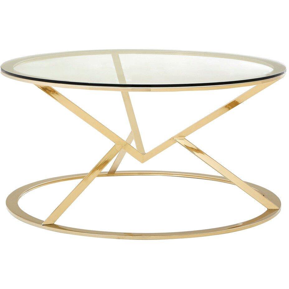Its base is made from sleek stainless steel, and has a reflective champagne gold colour. Two triangular forms create an inverted, asymmetric aesthetic, both of which are connected to wide circles at the top and bottom. Clear tempered glass is used for the tabletop. Display this angular piece with opulent boutique hotel furniture.
