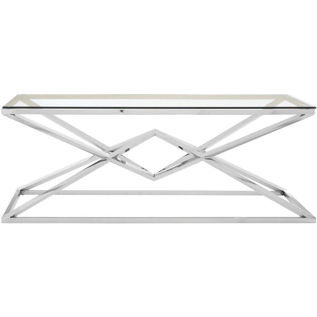 This coffee table has a rectangular design with a clear glass top and a silver finish stainless steel frame. The sculptural base has a dramatic open design with a pair of intersecting pyramid frames that create an intriguing diamond centre.