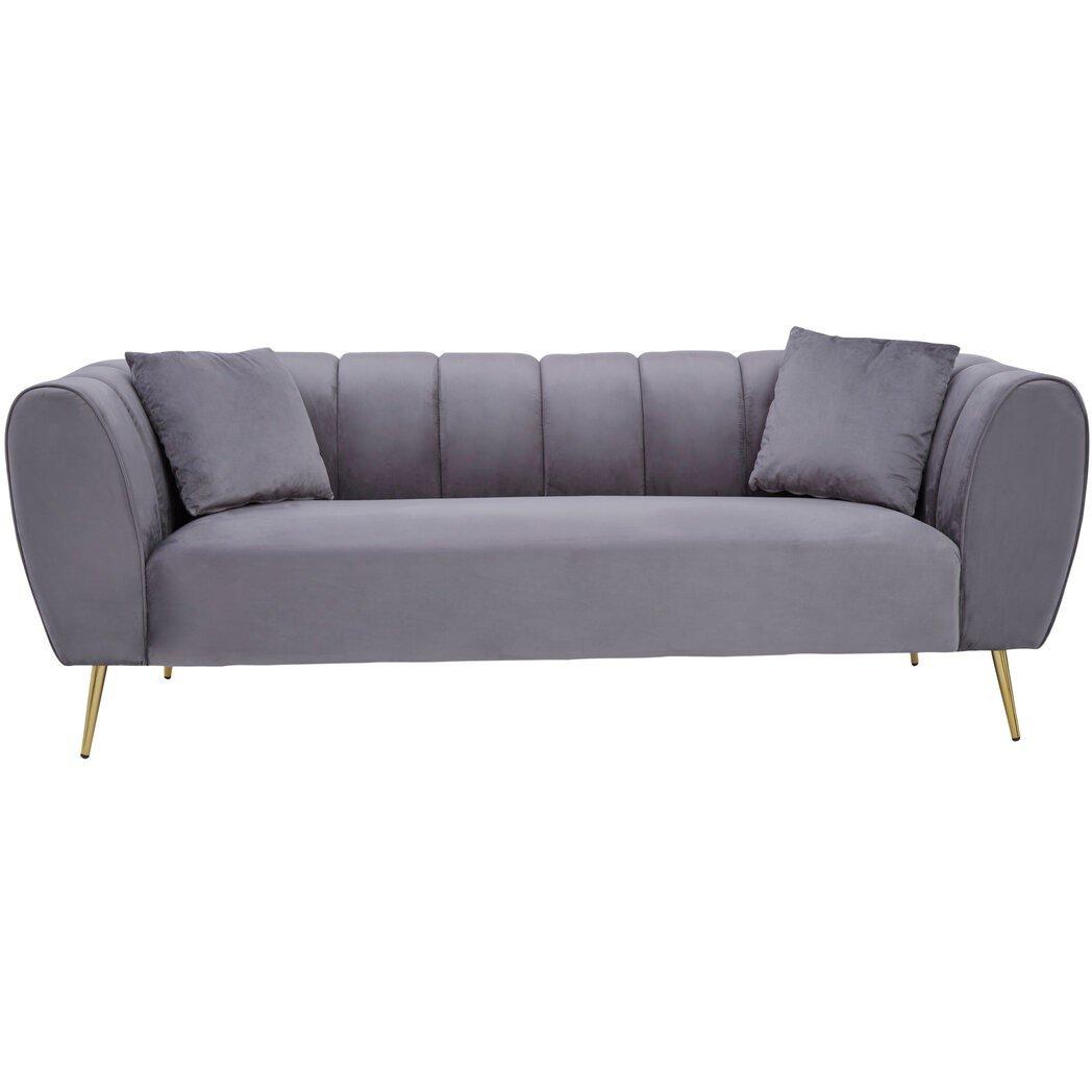 This grey velvet sofa brings a modern touch with flared arms. The vertical channel tufting on the back and armrests enhance visual appeal. The sofa takes inspiration from the tuxedo design with a level back and armrests.
