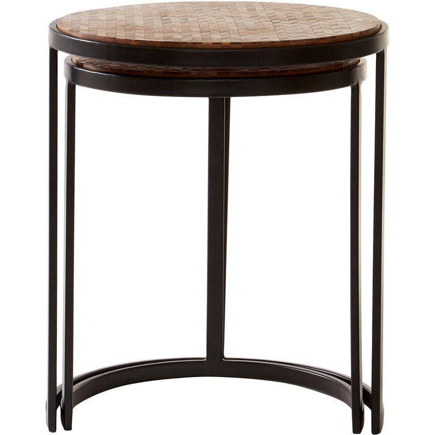 Their curving, crescent-shaped bases complement the rounded tabletops. The natural wood tops are patterned by light and dark brown chevron motifs. Every table is handcrafted meaning that is possesses its own subtle characteristics.