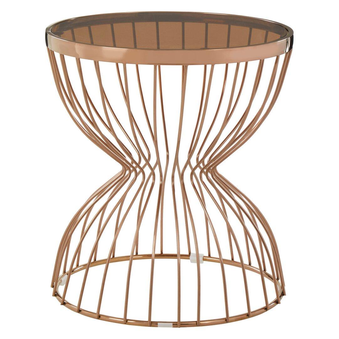 Slim lines of smooth stainless steel pinch at the centre to create an hourglass shape. The rose gold finish creates a soft metallic vibe, and the smoked tempered glass top produces a semi-transparent finish.