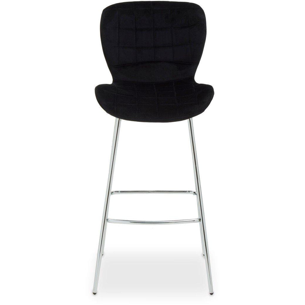 This bar chair is upholstered in sumptuous black velvet. The quilted seat and backrest of this chair are enhanced by fine stitching. The chair is complete with splayed silver finish legs and footrests, contributing to the clean aesthetic of the modern design.
