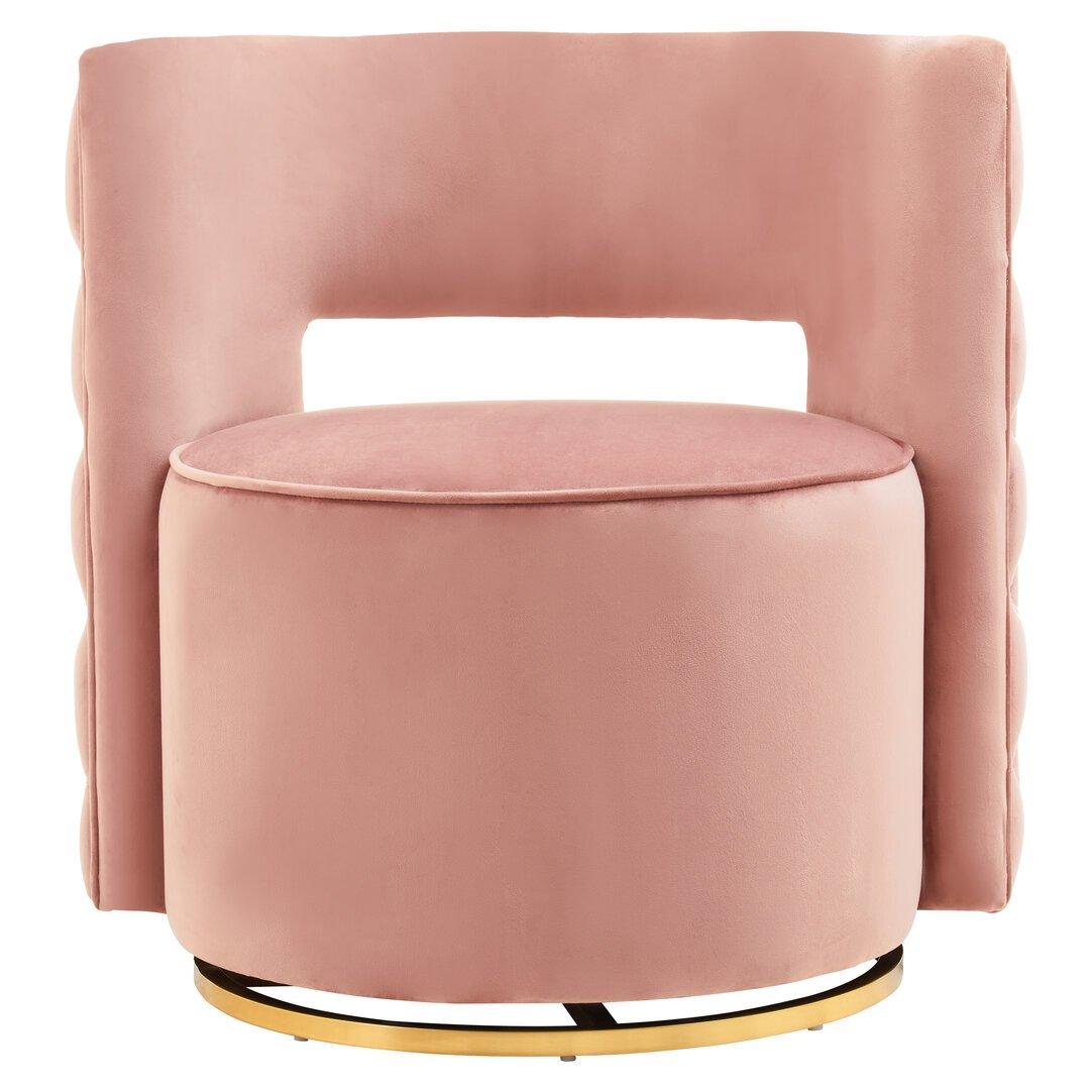 The Yasmeen chair has a circular seat with deep cushioning, upholstered in pink velvet. It is supported by a cutout back with a buttoned exterior. The luxurious seat is positioned on a base that rotates 360 degrees, increasing stability and glamour.