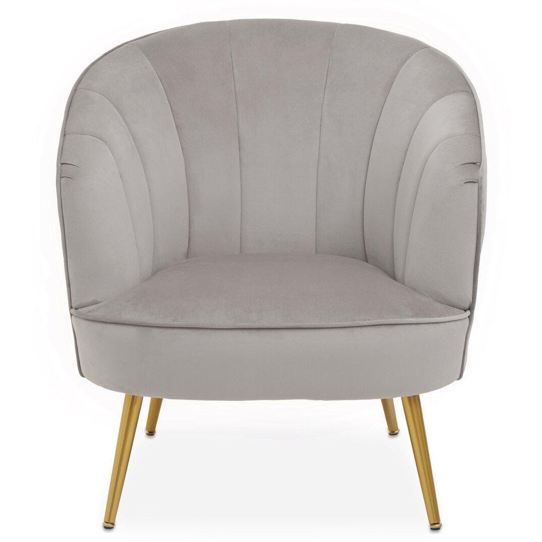 Upholstered in plush grey velvet, this chair creates an elegant aesthetic with a back in a curved silhouette and sloping armrests. The seat in generous padding rests above glistening metal legs in gold finish that updates the glam style statement.