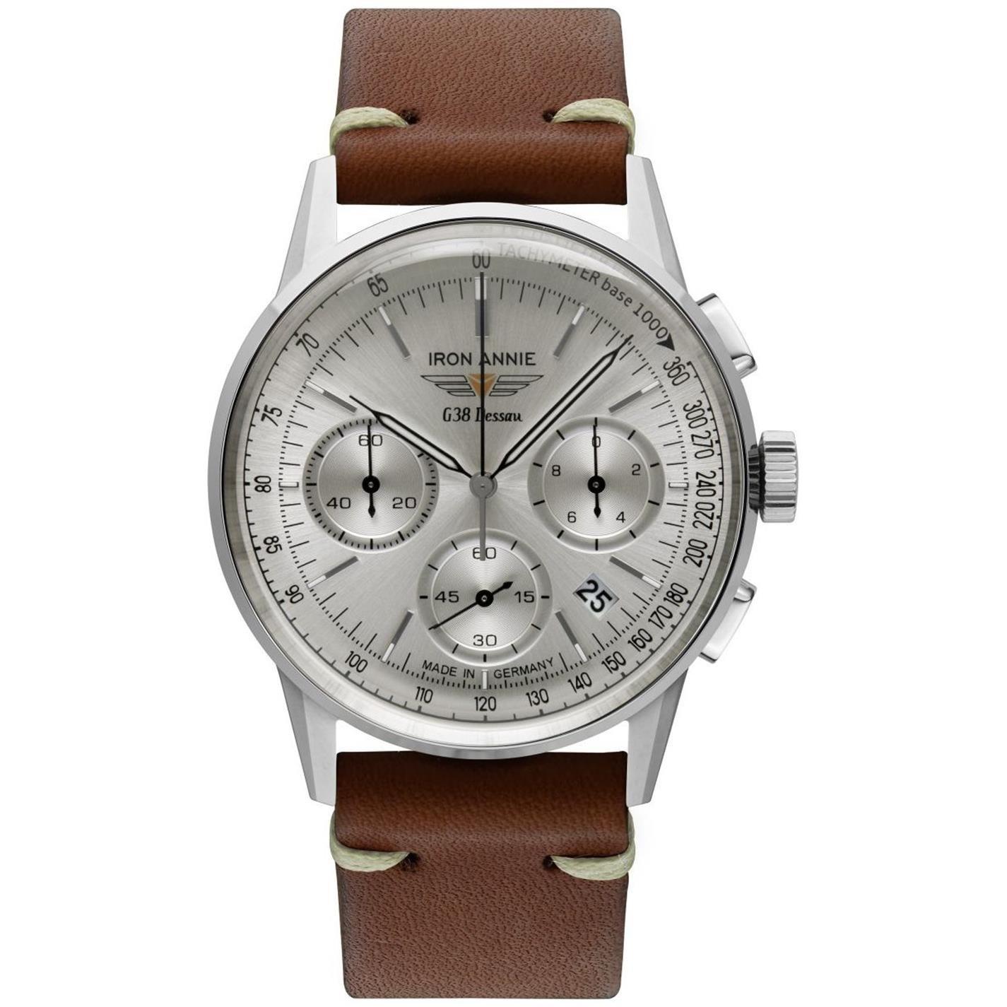 Iron Annie G38 Dessau 5376-1 is an amazing and handsome Gents watch. Material of the case is Stainless Steel and the Silver dial gives the watch that unique look. The features of the watch include (among others) a chronograph. 100 metres water resistancy will protect the watch and allows it to get submerged in the water for everyday usage including swimming, but not high impact water sports. We ship it with an original box and a guarantee from the manufacturer.