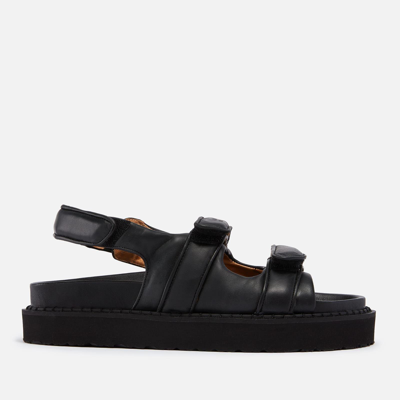 The sandals are made from black leather with a chunky platform sole and feature two adjustable Velcro straps on the upper and a single Velcro strap at the heel for a secure fit. The design also includes a moulded footbed and a treaded rubber sole for comfort and grip. The Isabel Marant logo is embossed on the top strap and the footbed.