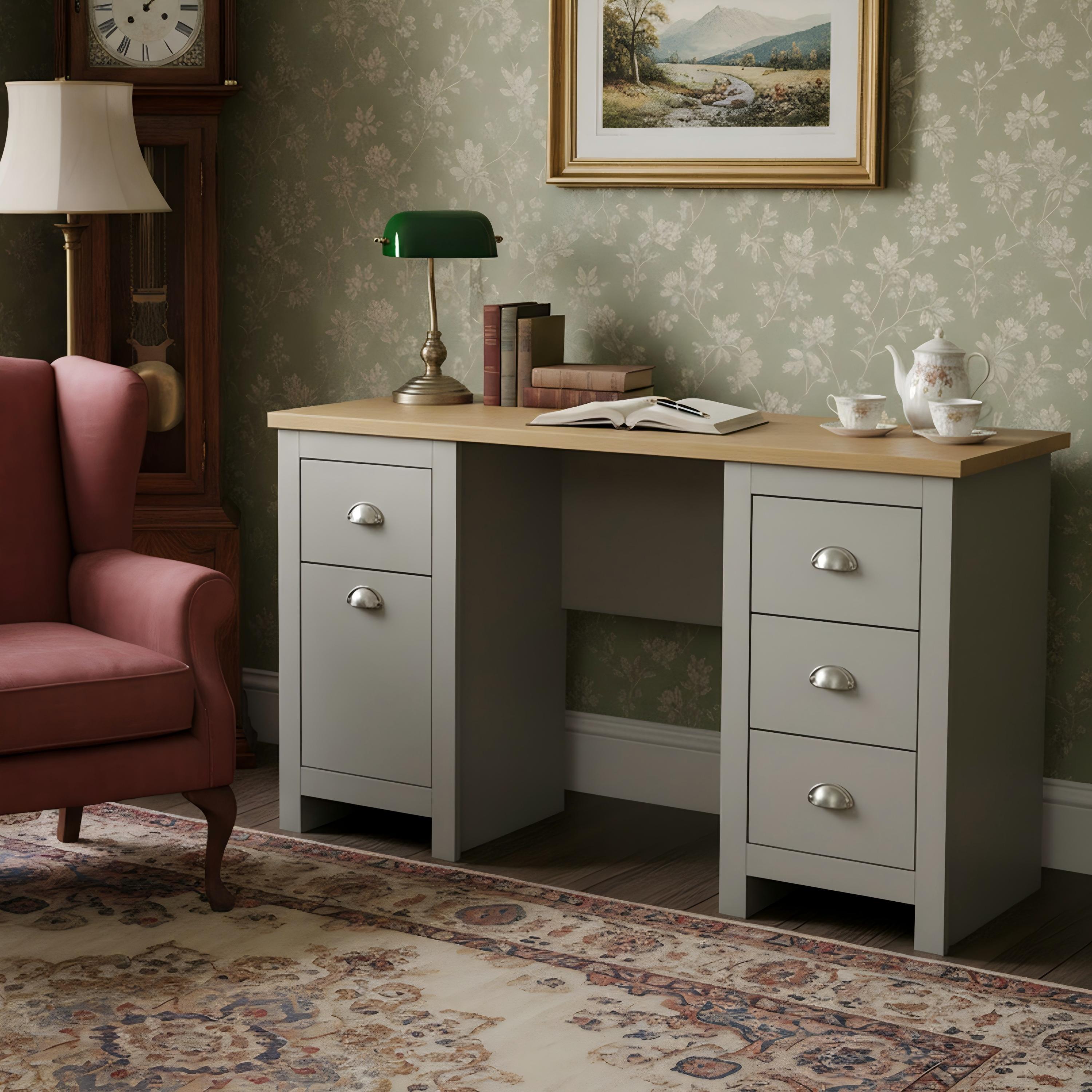 Features: 6 Drawer Configuration – Offers generous storage across two pedestal units for neatly organising your essentials. Spacious Top Surface – Wide desktop accommodates monitors, mirrors, laptops, or décor. Multi-Purpose Design – Perfect for use as a vanity table, writing desk, or home office station. Durable Build – Sturdy frame with smooth-gliding drawers and reinforced legs for everyday use. Stylish Metal Handles – Cup-style handles provide a refined, modern touch with easy access to contents. Product care – Dry cloth only.