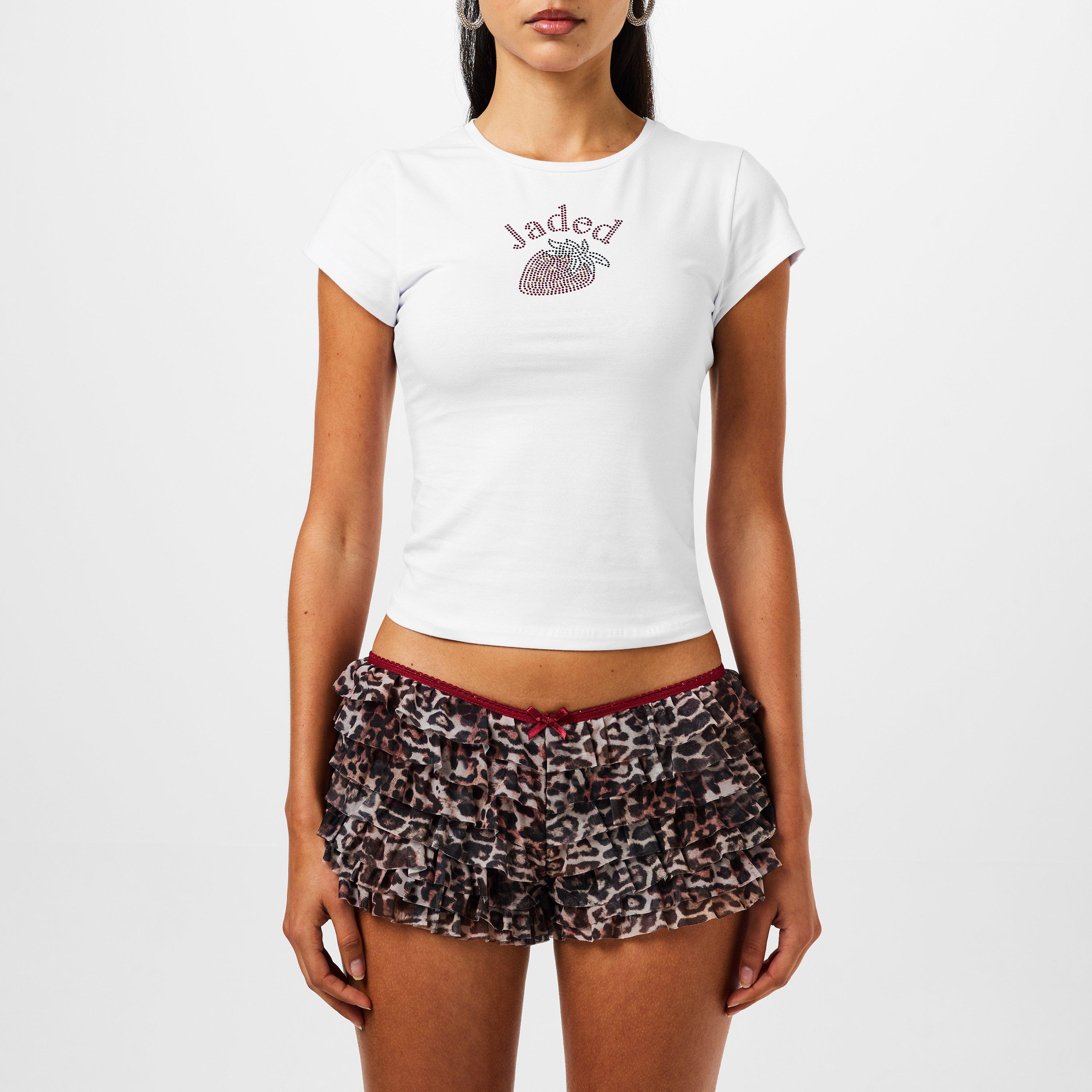 Revamp your everyday style with the Jaded London Lucia Diamante Baby Tee, a sparkling take on the classic white tee. Crafted from soft stretch jersey fabric, this t-shirt boasts a comfortable and body-hugging fit, making it a standout choice for casual outings and drinks with friends.