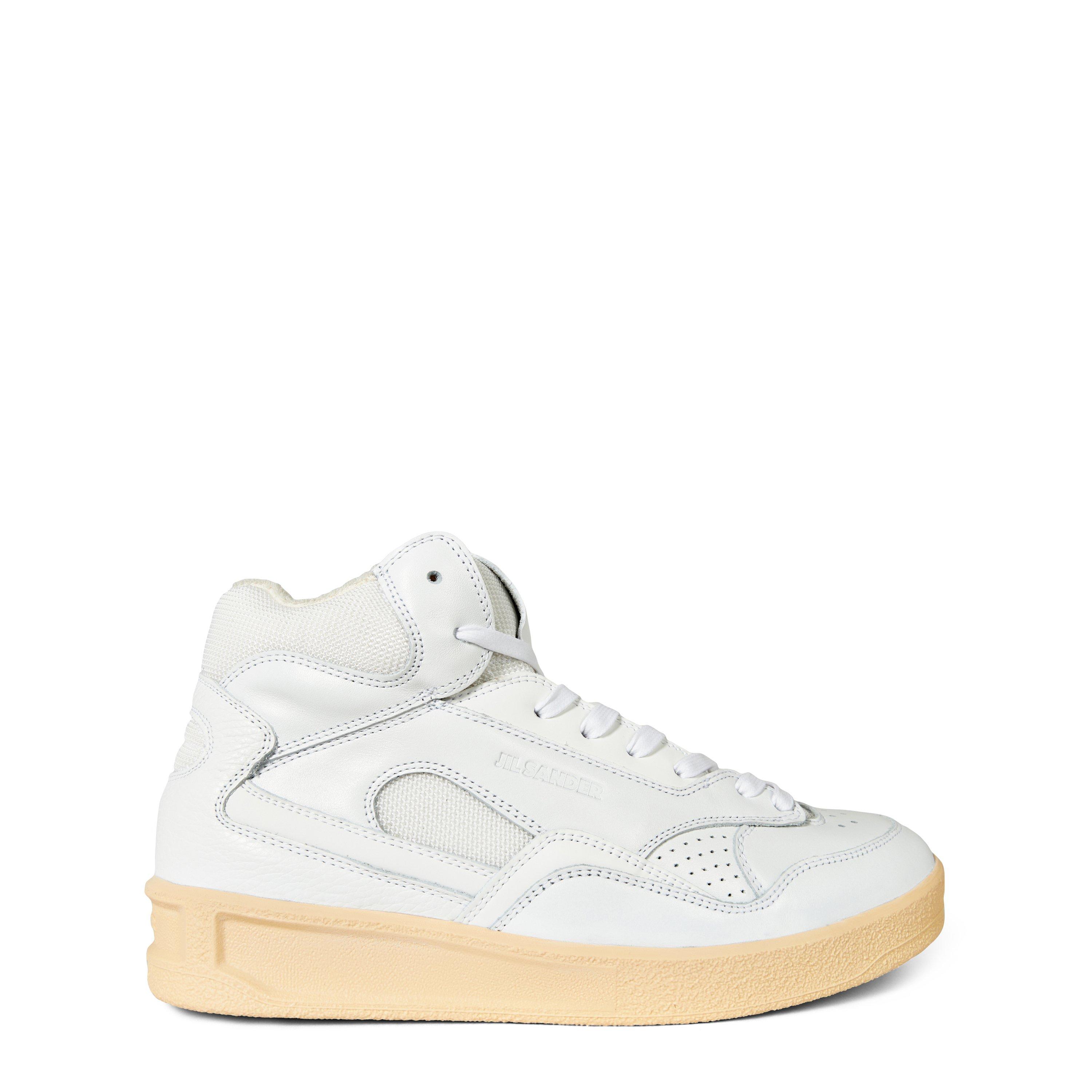 Jil Sander presents these Gum-Sole High-Top Trainers: an elevated take on a classic staple. Crafted with the utmost care and attention to detail with the finest calfskin and mesh uppers, these women's court shoes feature round toes with lace fastenings and padded cuffs to ensure a snug and comfortable fit that lasts all day. Classic gum rubber soles provide excellent grip and bring a sophisticated touch.