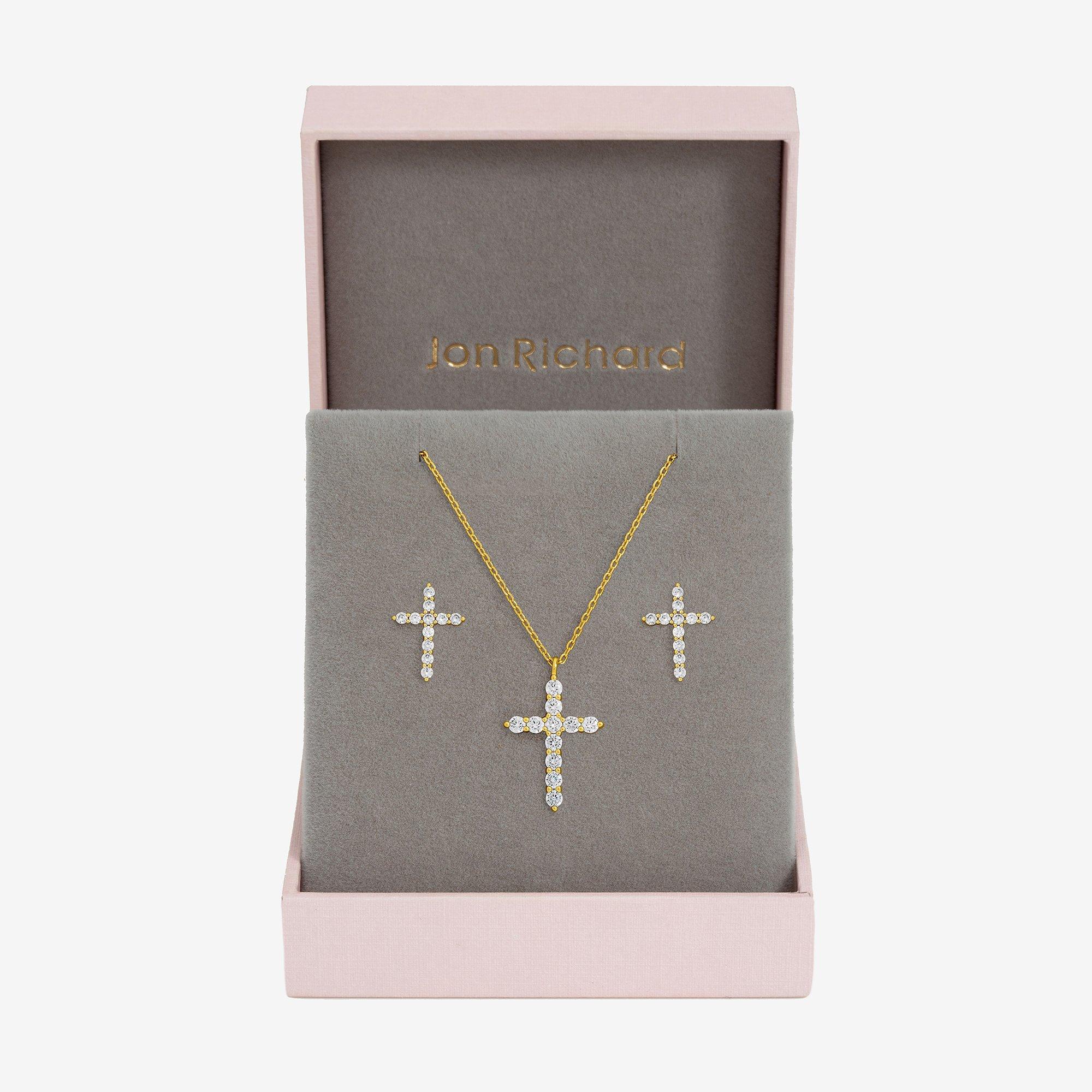 The Jon Richard Gold Plated Cubic Zirconia Cross Set captures timeless faith with radiant sparkle. Beautifully presented in a gift box for life's most meaningful moments. Beautifully presented in a reusable gift box. Fastening: Lobster clasp, post and bullet back. Width dimension: 12mm. Length dimension: 15mm. Material: Gold plated base metal. Chain length: 16. Extender length: 2.