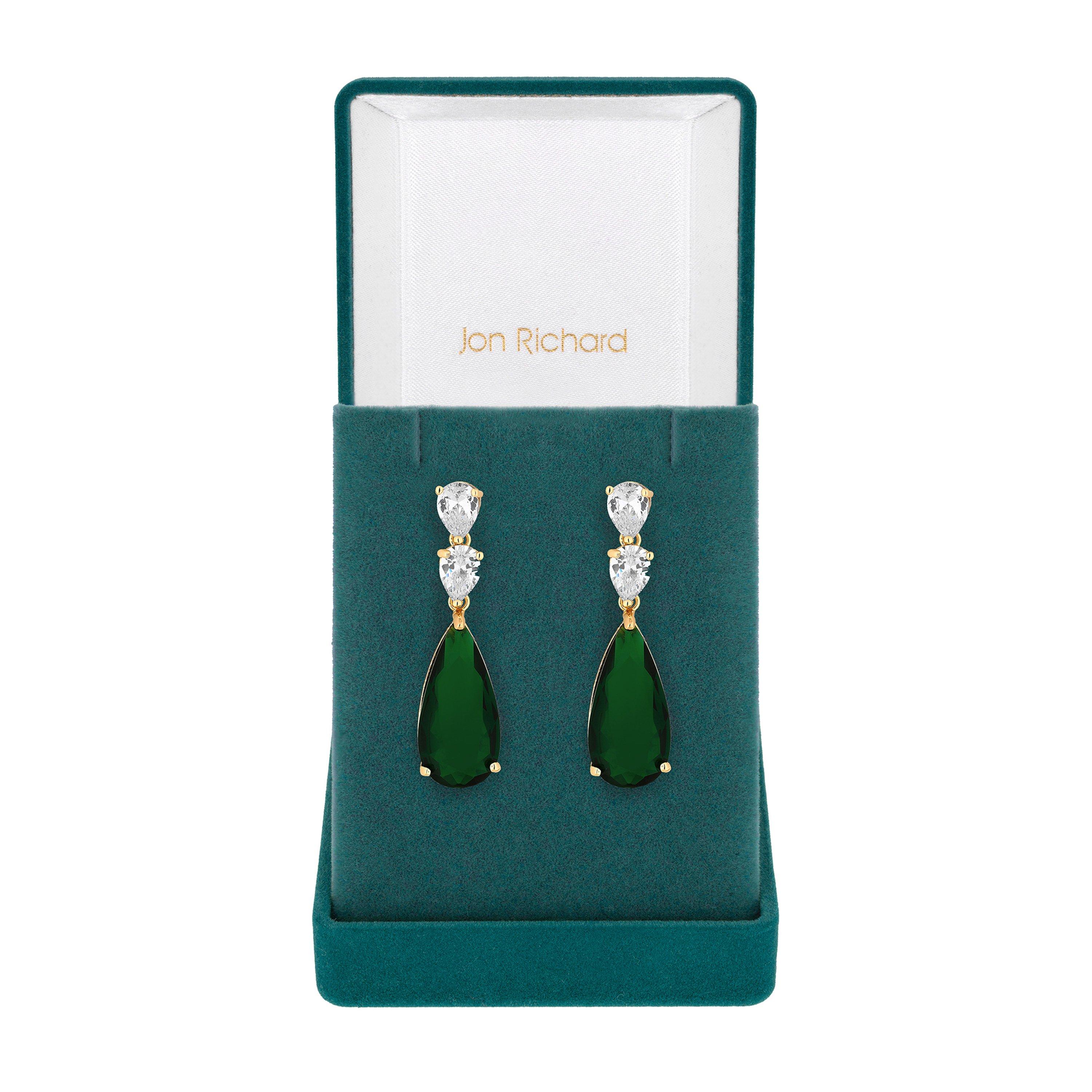 Our Jon Richard green drop earrings are a must-have in your jewellery box this season. Featuring cubic zirconia crystals in a single stone setting, this simple and elegant design will add a touch of sparkle to any outfit. These earrings can be worn separately or layered with other pieces. Presented in a beautiful Jon Richard gift box, these earrings are the perfect gift for yourself or a loved one. Fastening: Post and Bullet Back. Material: Silver Plated Base Metal. Width Dimension: 10mm. Drop Dimension: 35mm.