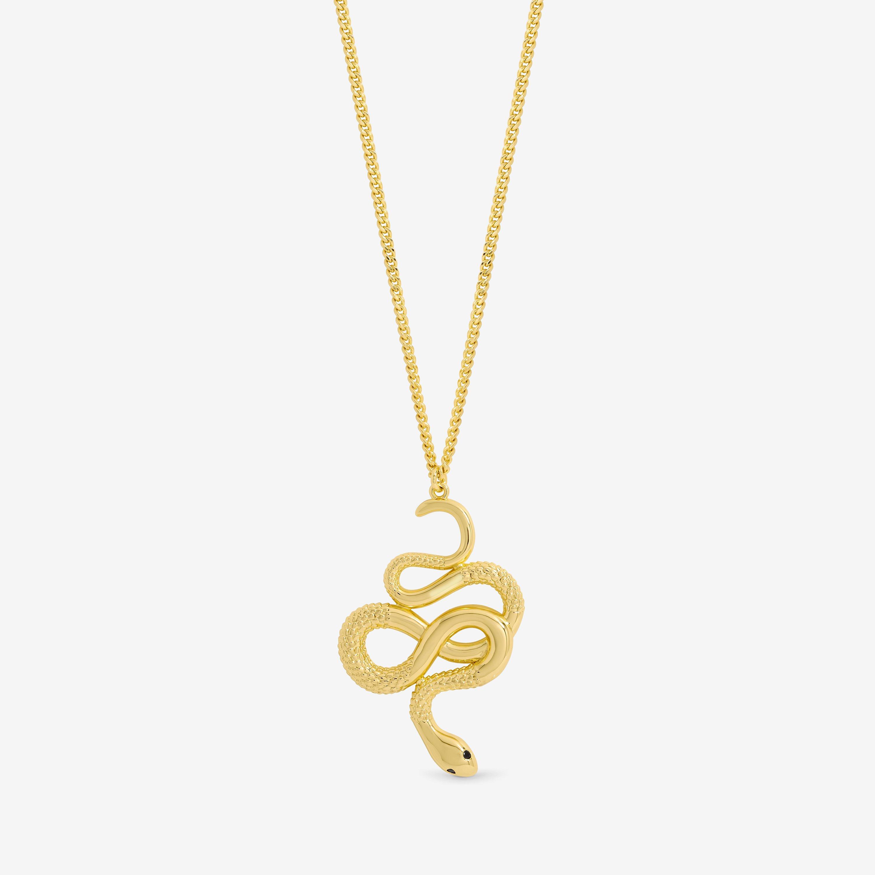 Our Gold Plated Snake Long Pendant features a striking design that brings a sleek edge to any look. Crafted in a radiant gold-tone finish, this elongated necklace features a gracefully curved snake, an ancient symbol of transformation and strength. Fastening: lobster clasp. Width Dimension: 35mm. Length Dimension: 55mm. Chain Length: 31.5. Material: Gold Plated Base Metal.