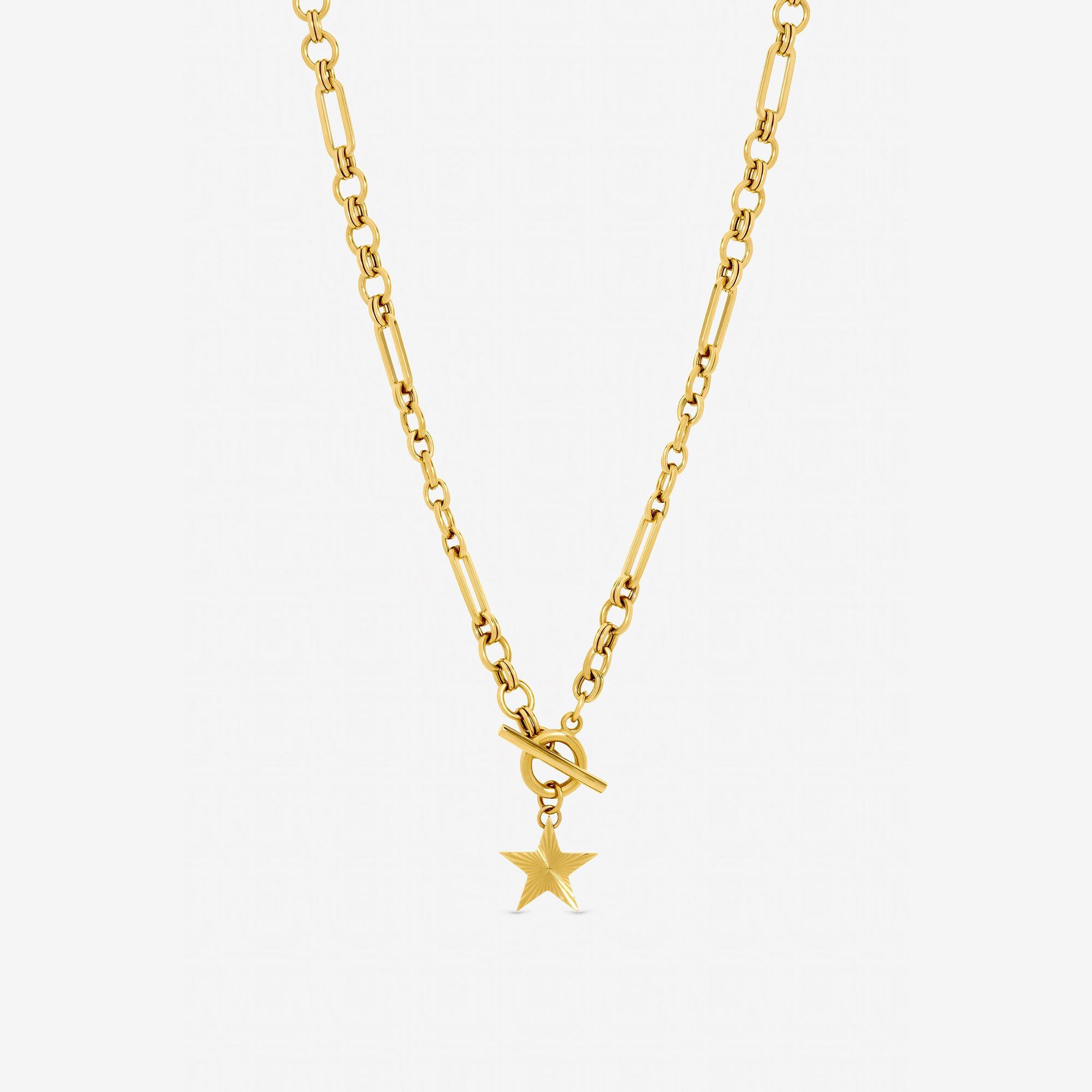 This necklace features a diamond-cut star and a T-bar design, blending utility with subtle glamour. Built with waterproof stainless steel, it is a high-performance piece designed for daily reliability and lasting brilliance. Fastening: T-Bar. Width dimension: 11mm, length dimension: 14mm. Material: Gold plated stainless steel. Chain length: 16, extender length: 2.