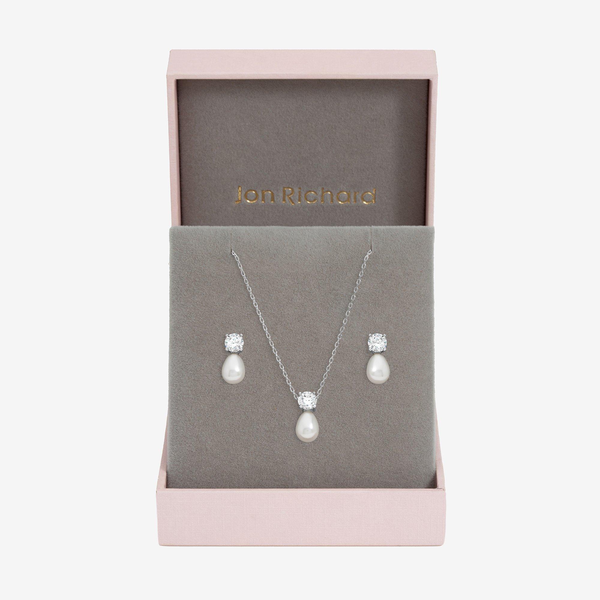 The Jon Richard Rhodium Plated Crystal and Pearl Bridal Set blends classic pearls with radiant crystals. A luminous design for brides who believe in timeless beauty and eternal elegance. Beautifully presented in a reusable gift box. Fastening: Lobster clasp, post and bullet back. Width dimension: 6.6mm. Length dimension: 13mm. Material: Rhodium plated base metal. Chain length: 16. Extender length: 2.