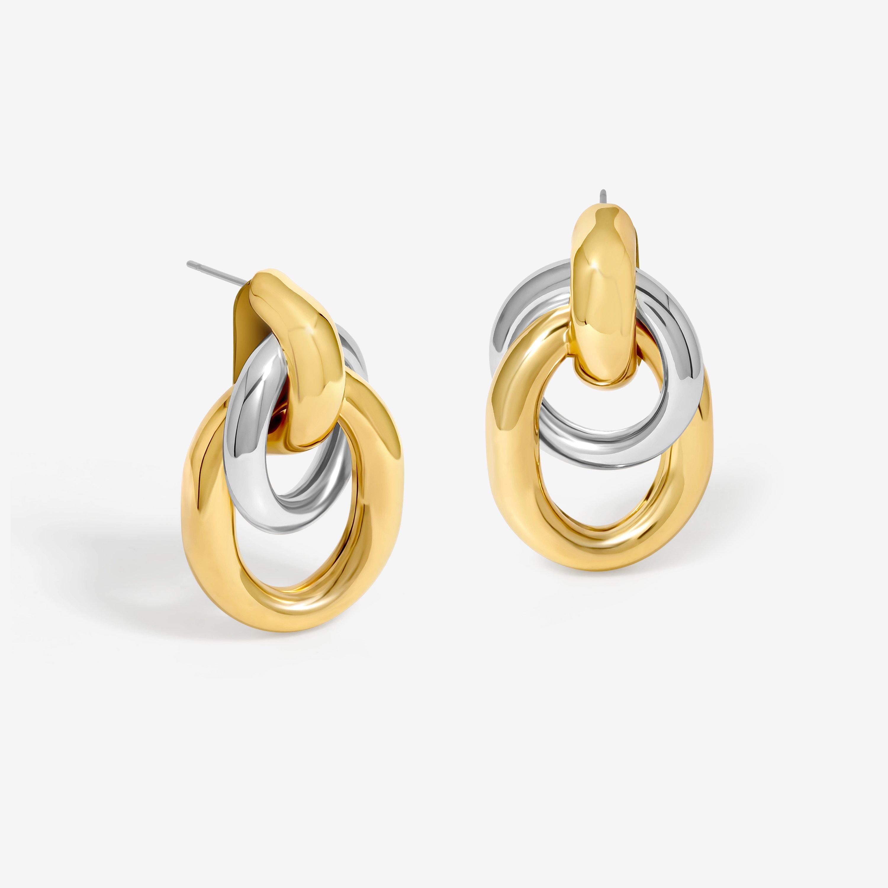 Our Jon Richard Two Tone Door Knocker Earrings feature a sleek and modern design with a striking two-tone finish. Wear solo or layer up to curate your own earring stack. Fastening: Post and Bullet Back. Width Dimension: 20mm. Length Dimension: 35mm.