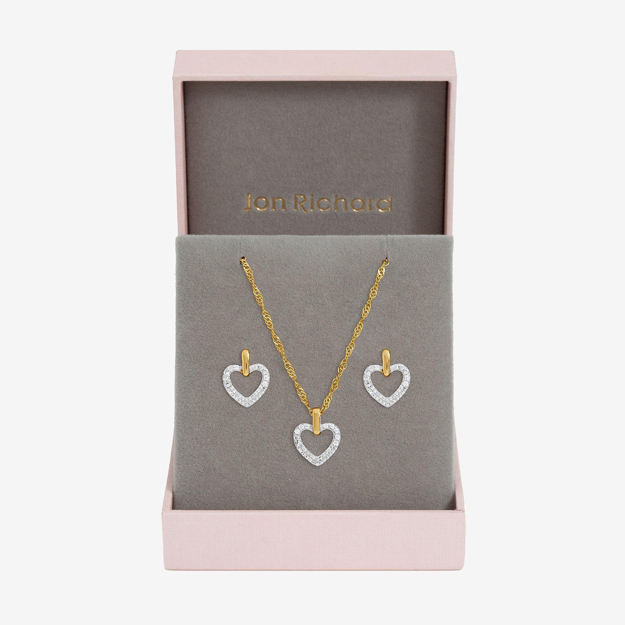 The Jon Richard Two Tone Open Heart Set celebrates love in all its shades. Crafted in silver and gold, it's a modern expression of harmony, unity, and everlasting affection. Beautifully presented in a reusable gift box. Fastening: Lobster clasp, post and bullet back. Width dimension: 10mm. Length dimension: 15mm. Material: Two tone plated base metal. Chain length: 16. Extender length: 2.