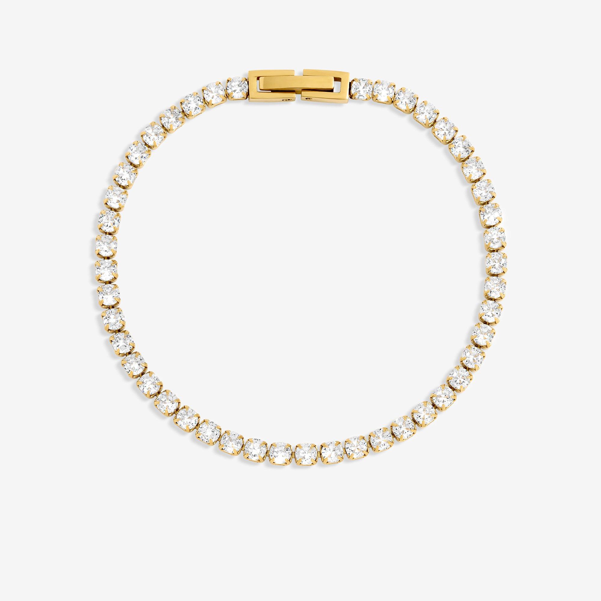 Our Gold Plated Stainless Steel Tennis Bracelet is the perfect classic design. With shimmering stones this bracelet adds elegance and glamour, the perfect finishing touch. Made of stainless steel, it,s the perfect addition to any Jewellery collection. Everyday elegance, made to last. Our jewellery is crafted using PVD-coated metals and sealed with a specialist waterproof finish to prevent tarnishing. Durable, waterproof, and hypoallergenic. perfect for wear-all-day ease. Fastening: Lobster Clasp. Length Dimension: 177.8mm. Material: Gold Plated Base Metal.