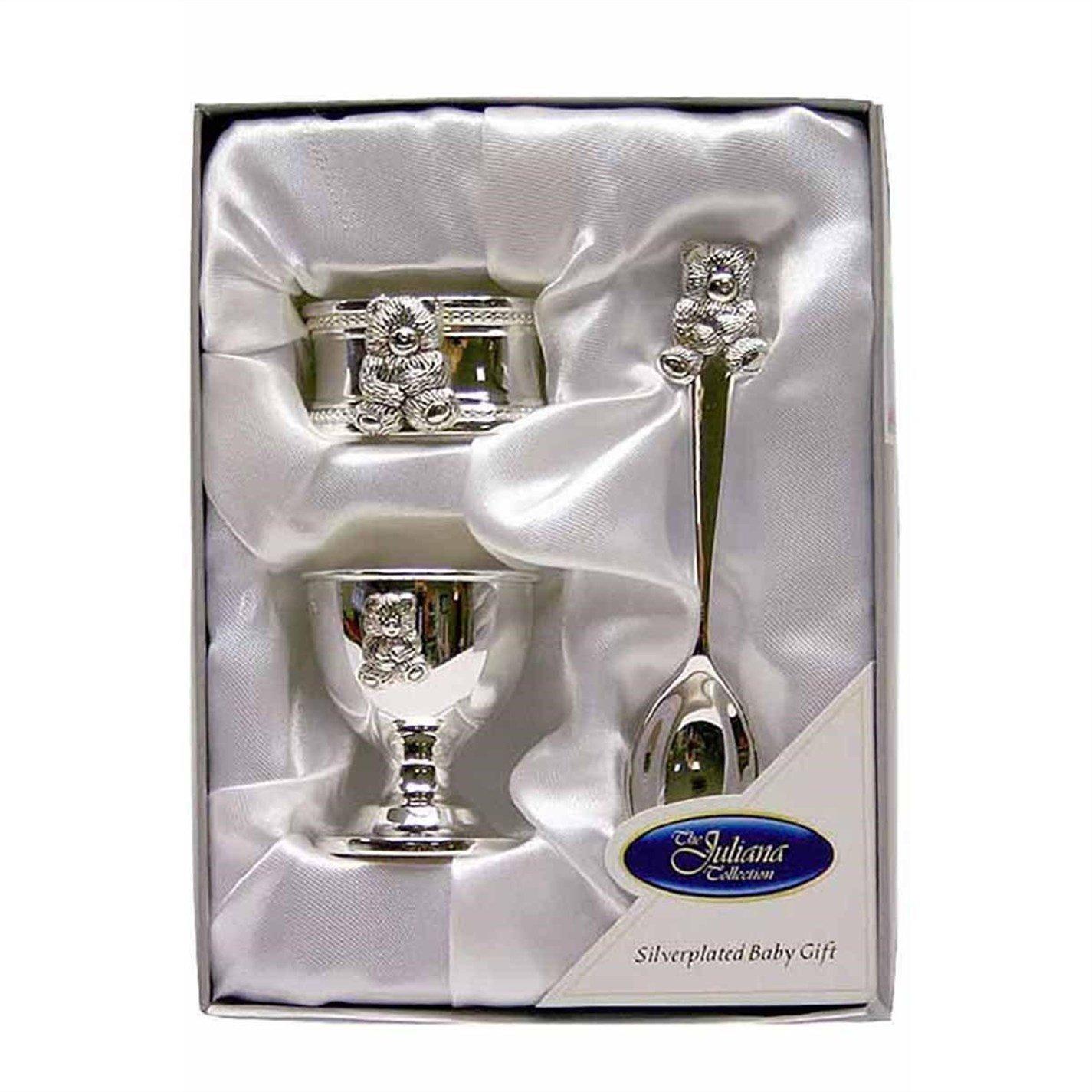 Whether it's for a baby shower, first birthday, christening or just to welcome a new born into the family, this napkin rim, egg cup and spoon will be treasured for many years. This beautiful silver-plated set is adorned with cute teddy bear embellishments.